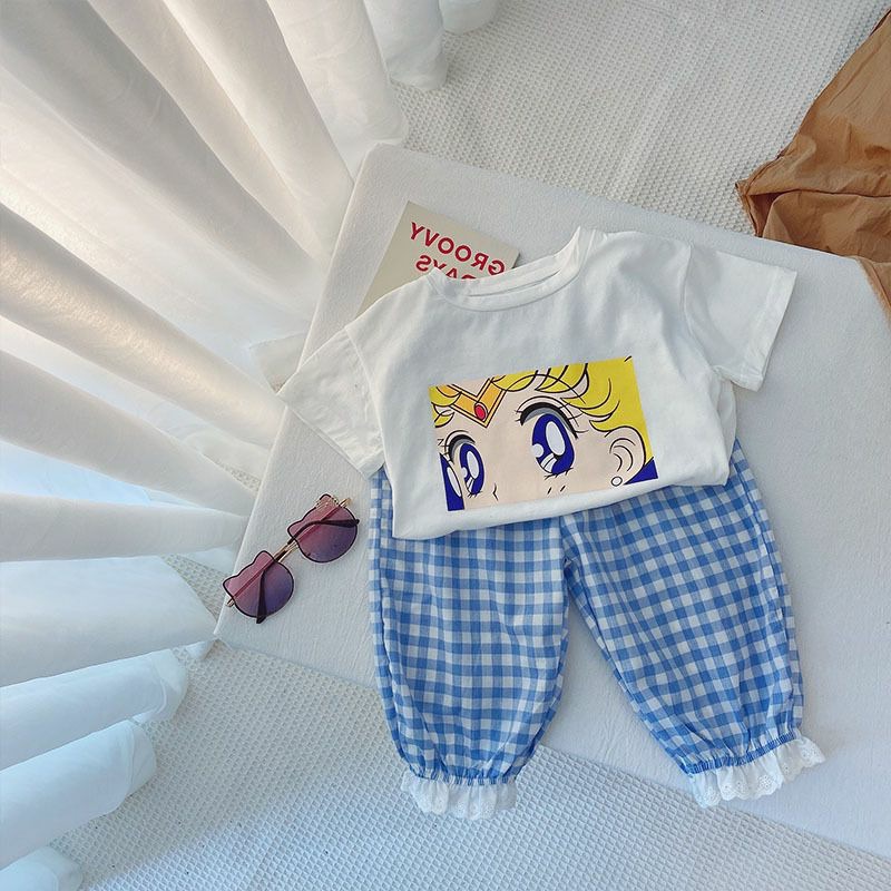 夏季女童套装宝宝洋气儿童个性潮牌外贸INS卡通短袖T恤花边格子裤