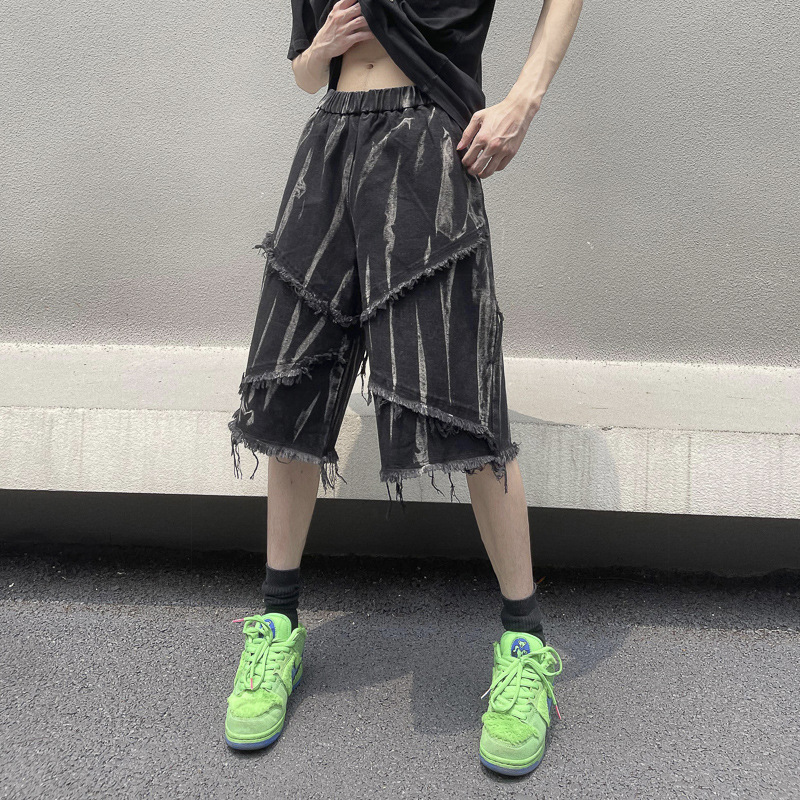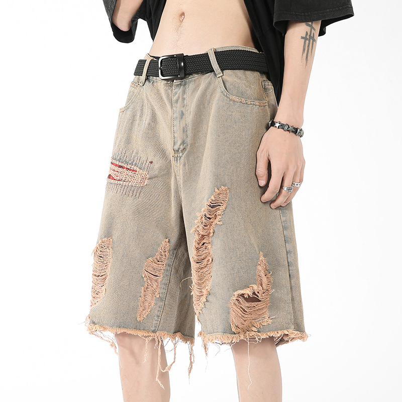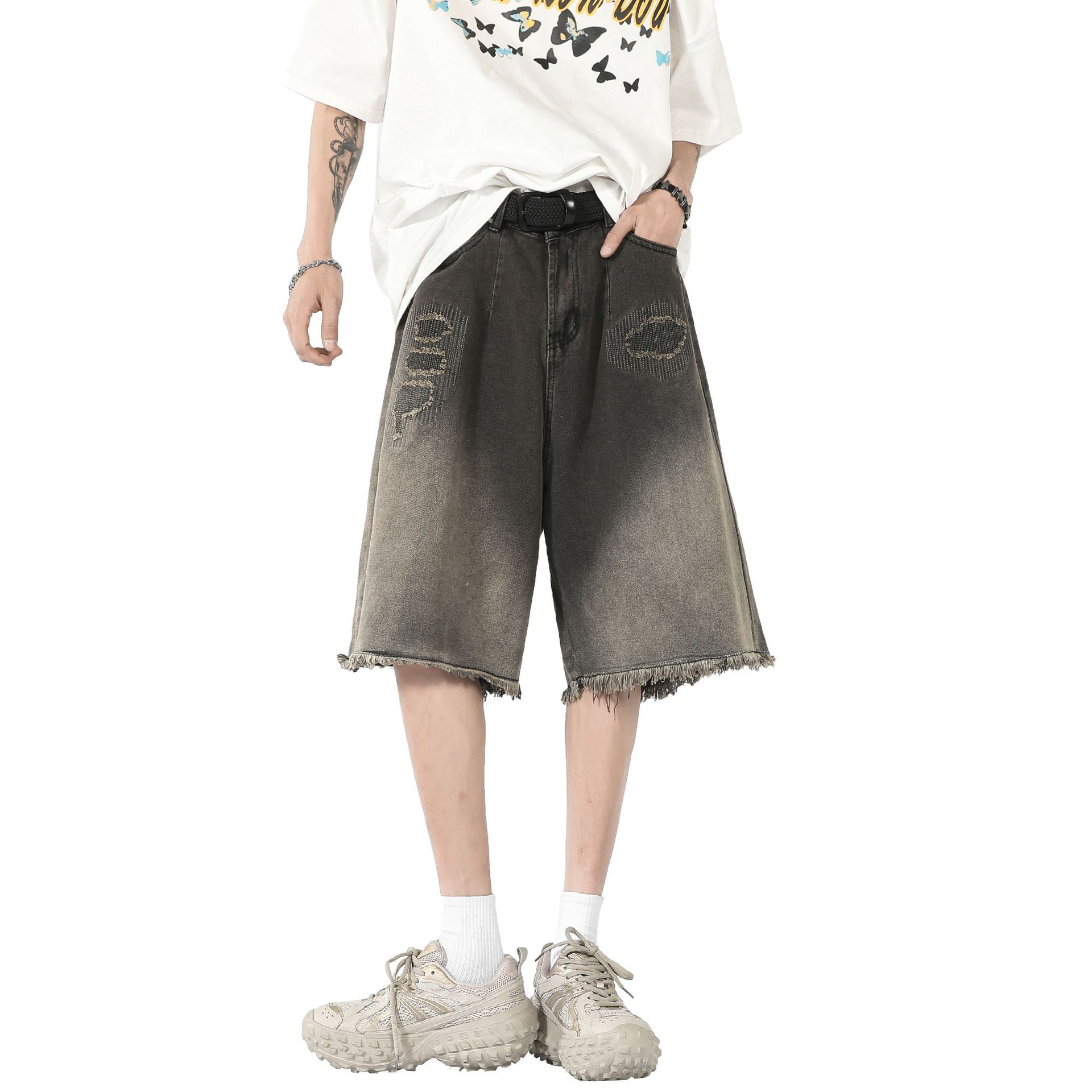 男士牛仔短裤夏季薄款直筒五分裤户外潮牌破洞流苏乞丐宽松休闲裤