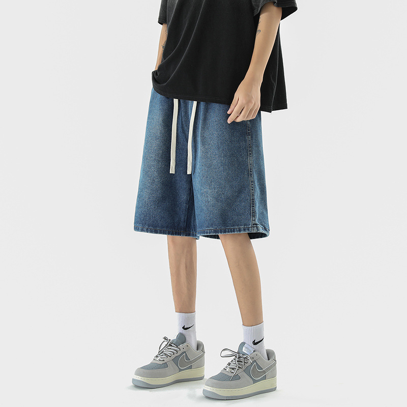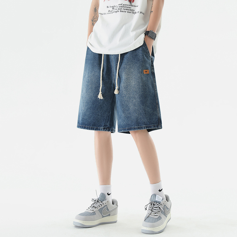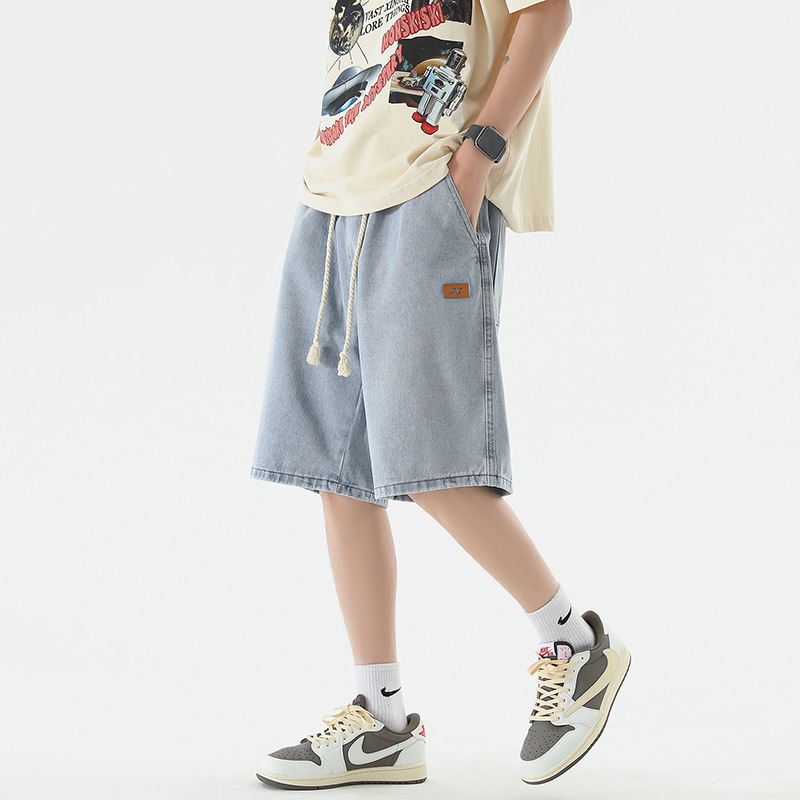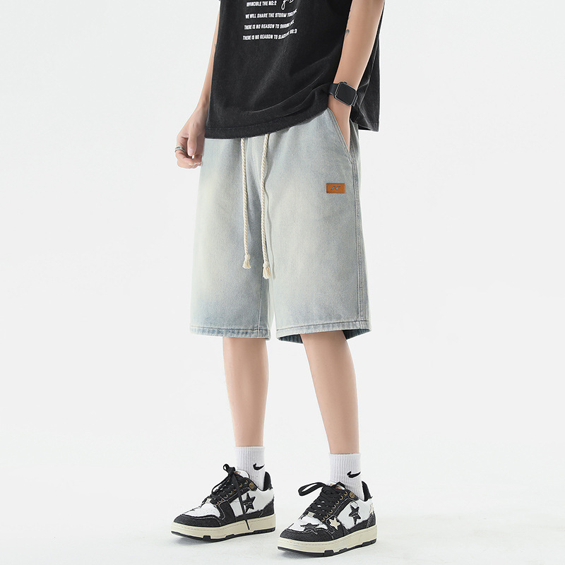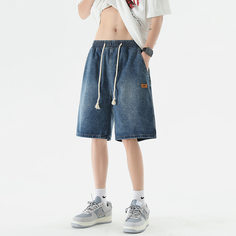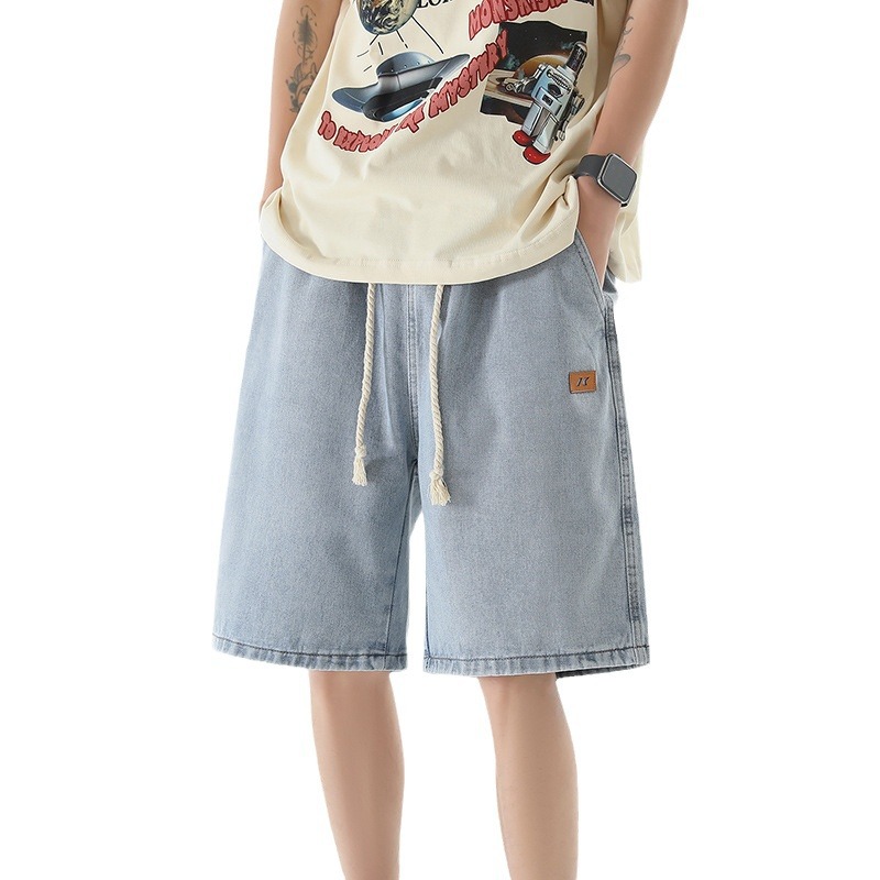 夏季薄款牛仔短裤男士宽松休闲五分裤高街复古水洗松紧腰休闲裤子