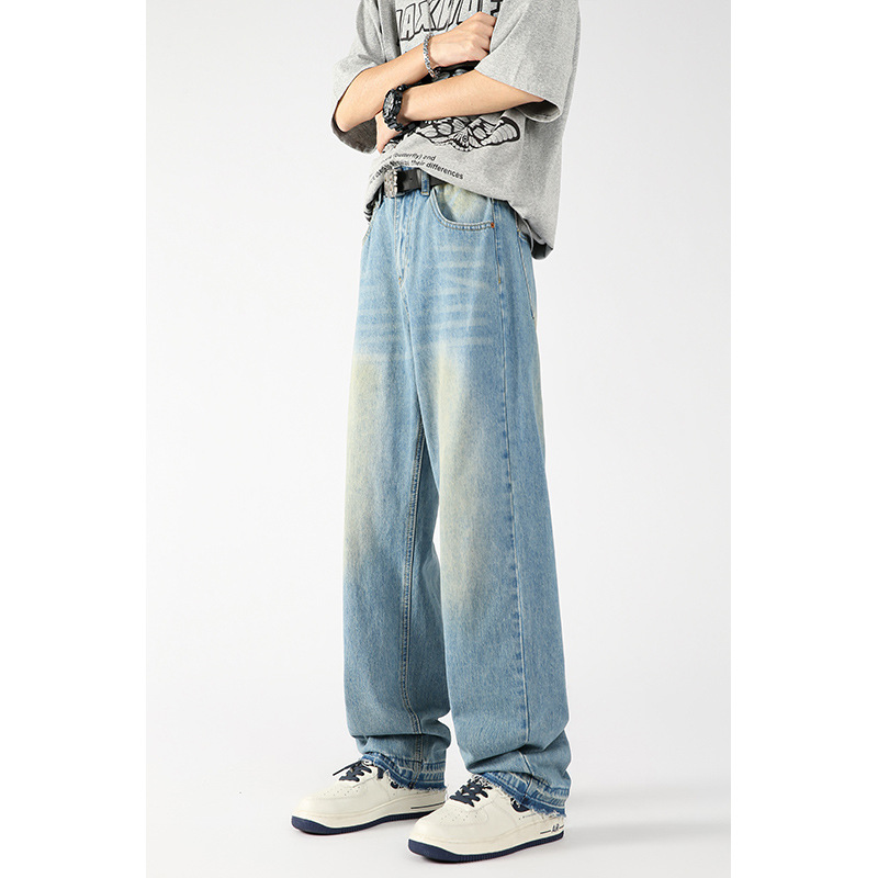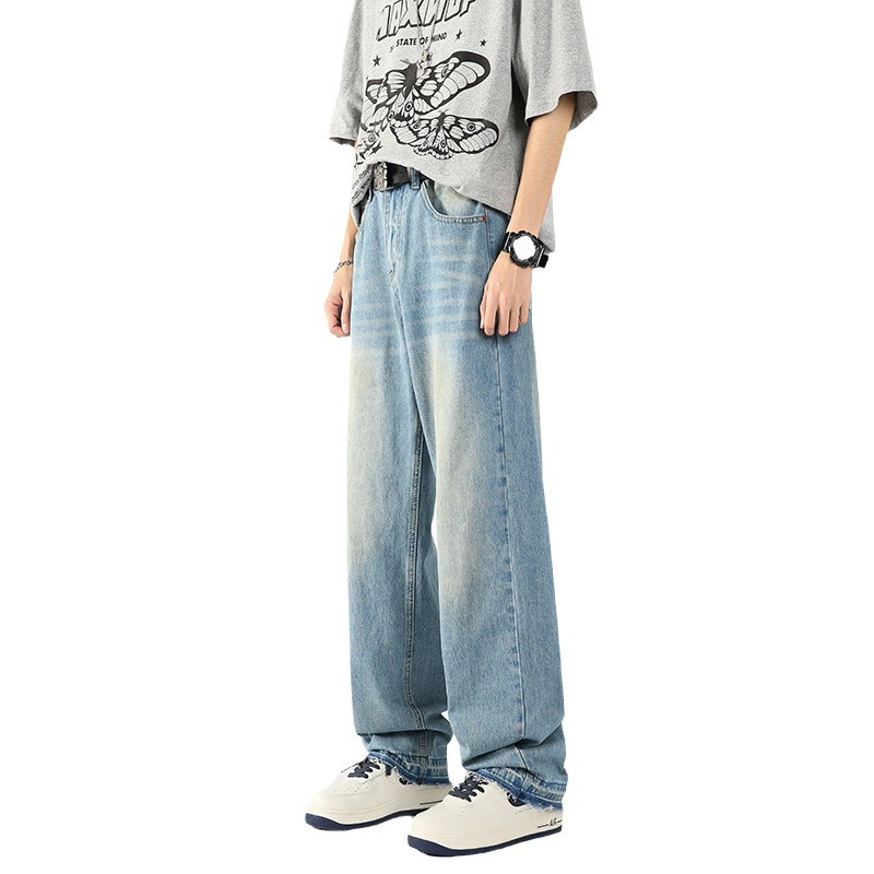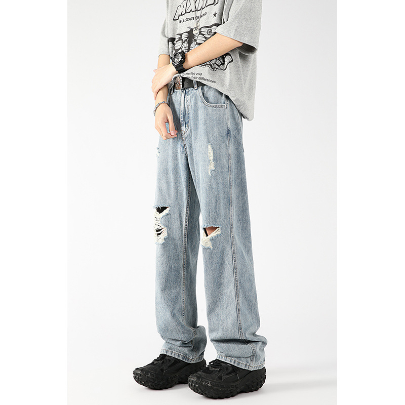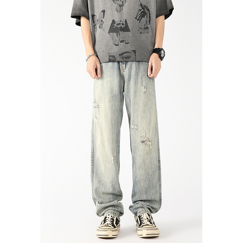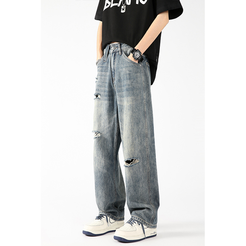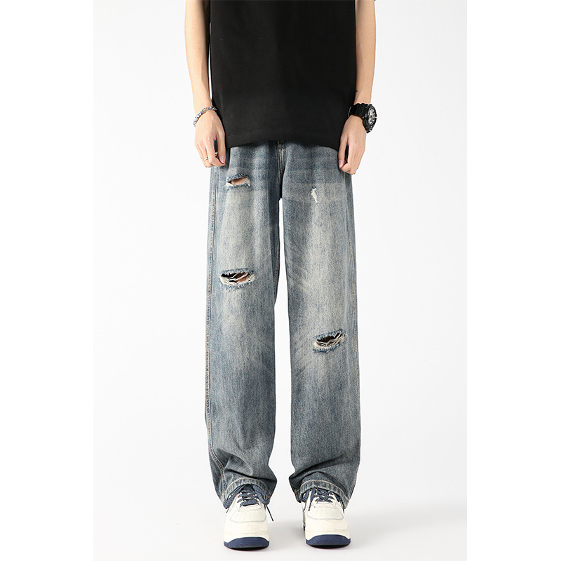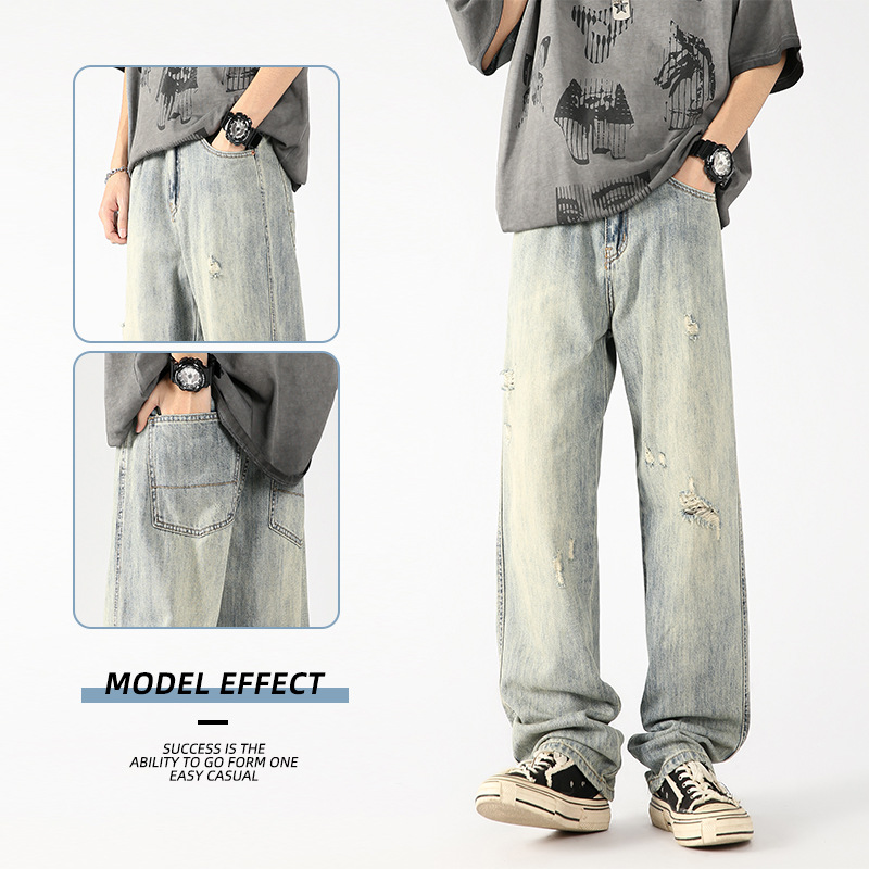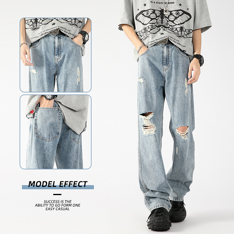 美式水洗破洞牛仔裤男宽松直筒阔腿裤夏天oversize百搭冰丝裤潮牌