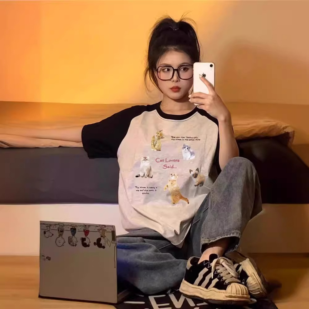 高级感纯棉插肩短袖t恤女夏季宽松胖mm大码复古潮牌ins半袖上衣服