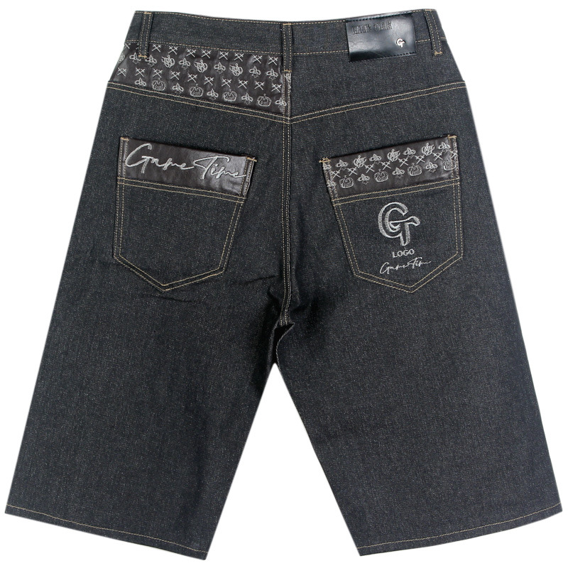 欧美嘻哈牛仔裤男潮流宽松刺绣短裤街头七分裤HIPHOP大码滑板中裤