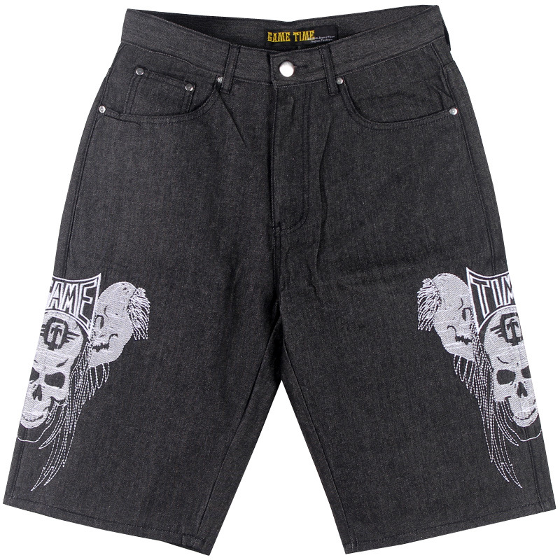 跨境欧美牛仔短裤男潮流宽松滑板中裤嘻哈大码骷髅刺绣花七分裤子
