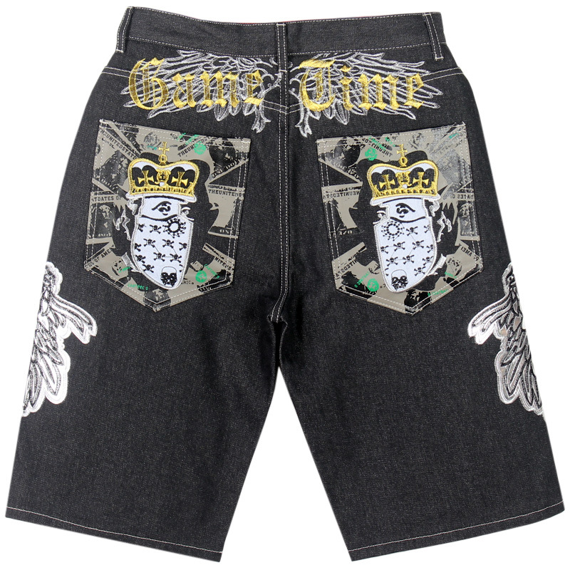欧美嘻哈牛仔短裤男宽松大码七分裤潮牌青年加肥加大刺绣滑板中裤