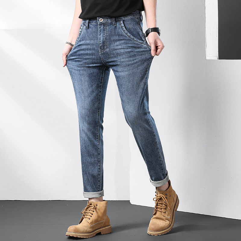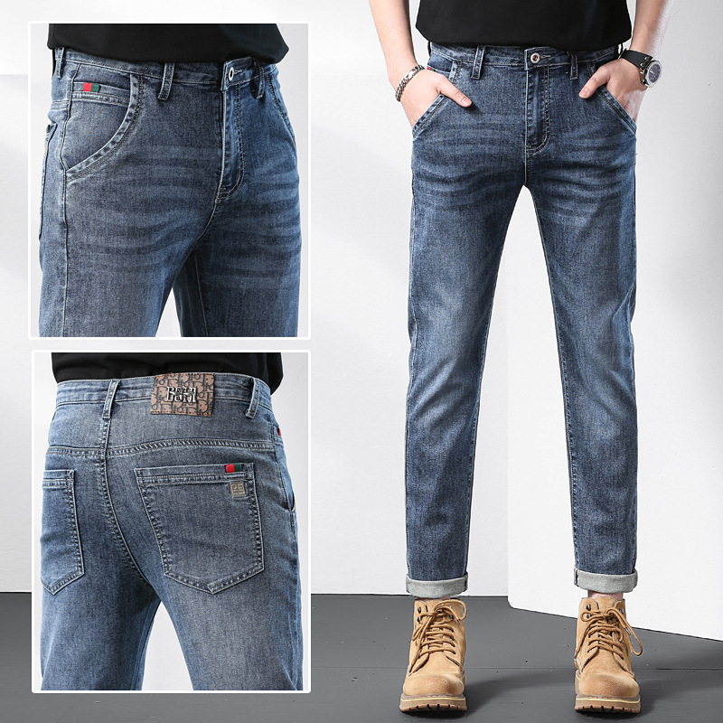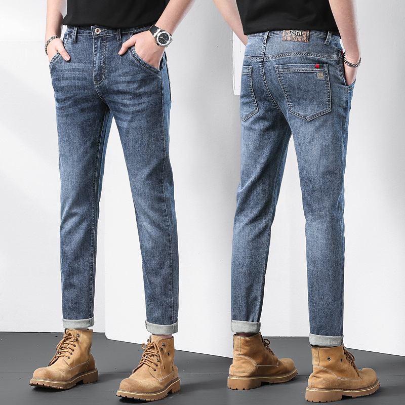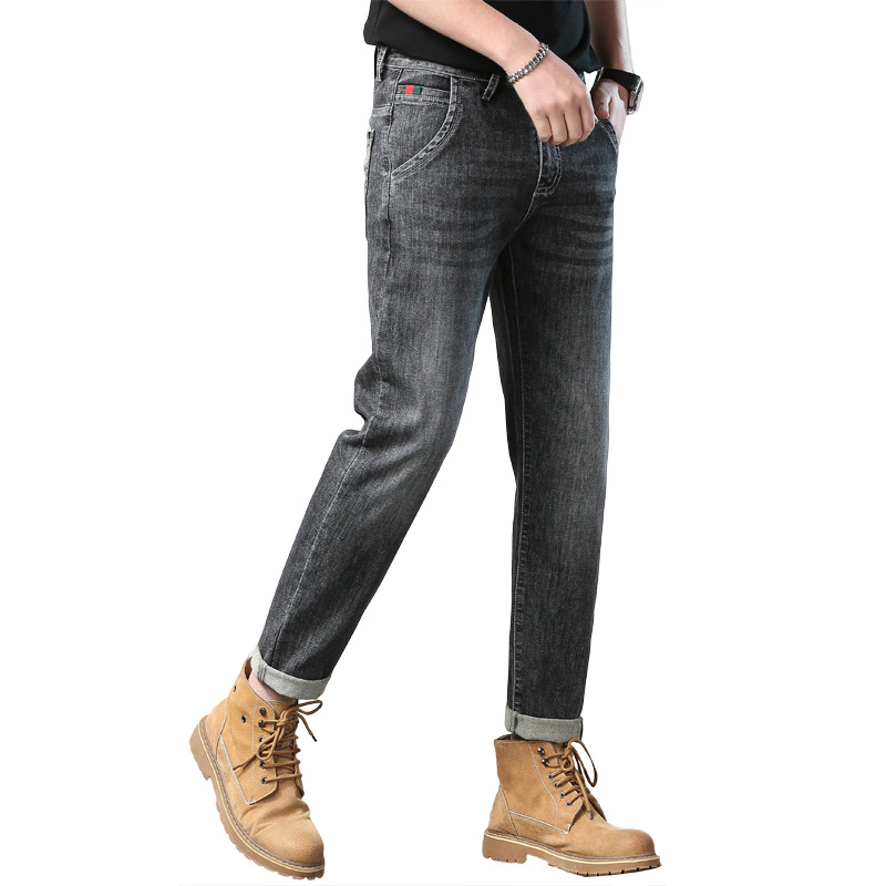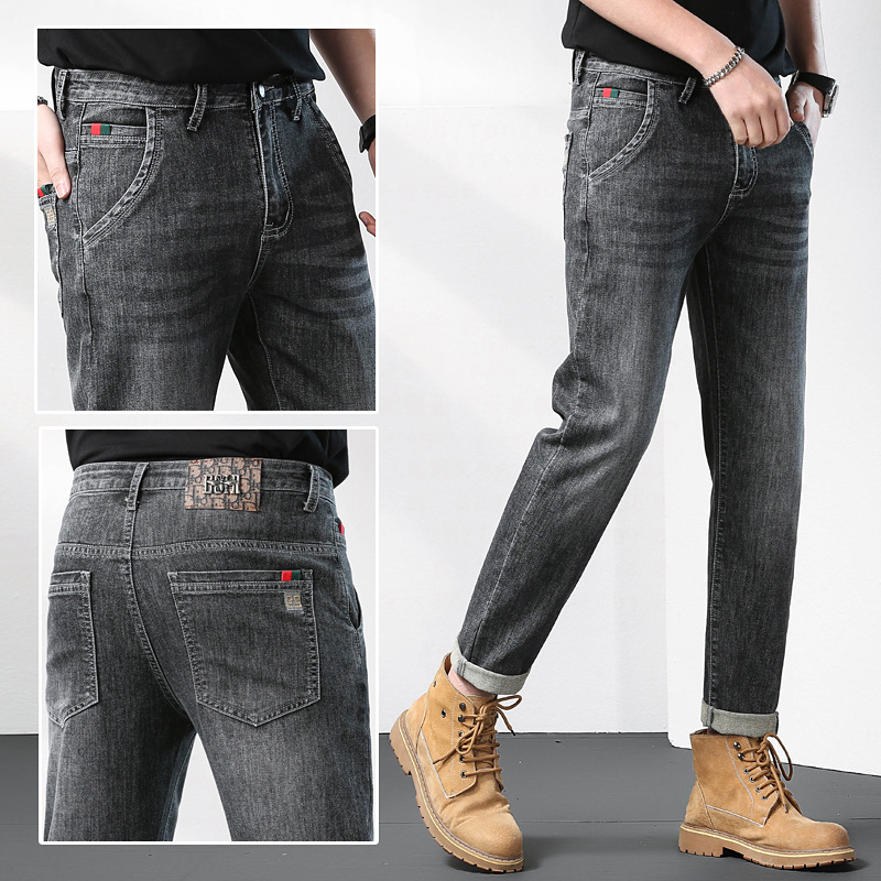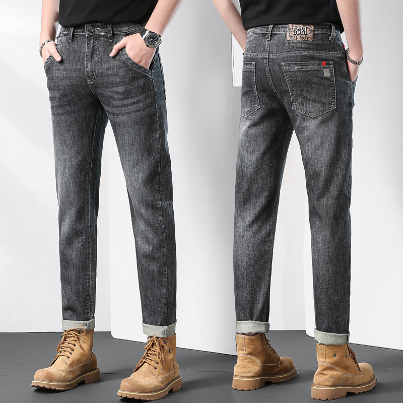 秋季新款斜插口袋黑灰刺绣男士合身小脚修身哈伦四季弹性牛仔裤子