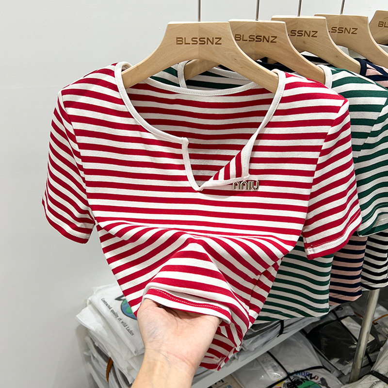 v领条纹正肩短袖t恤女设计感小众夏季洋气别致垫肩短款上衣体恤女