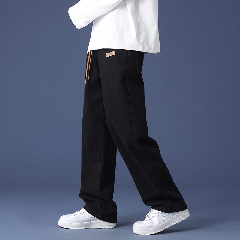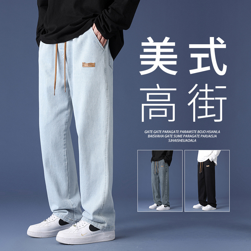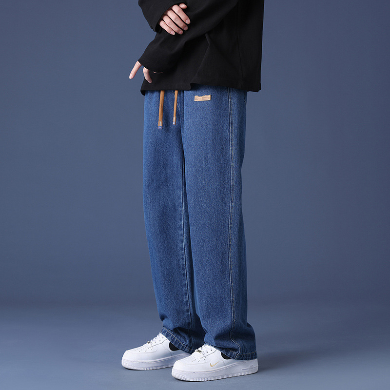 牛仔裤男士美式复古松紧带长裤加绒秋冬季宽松直筒阔腿高街休闲裤
