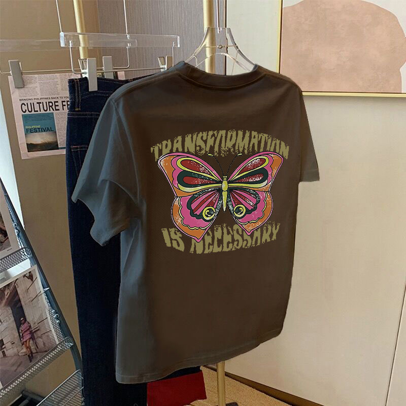 2025夏季新款正肩纯棉灰色蝴蝶短袖t恤女宽松时尚休闲设计感上衣
