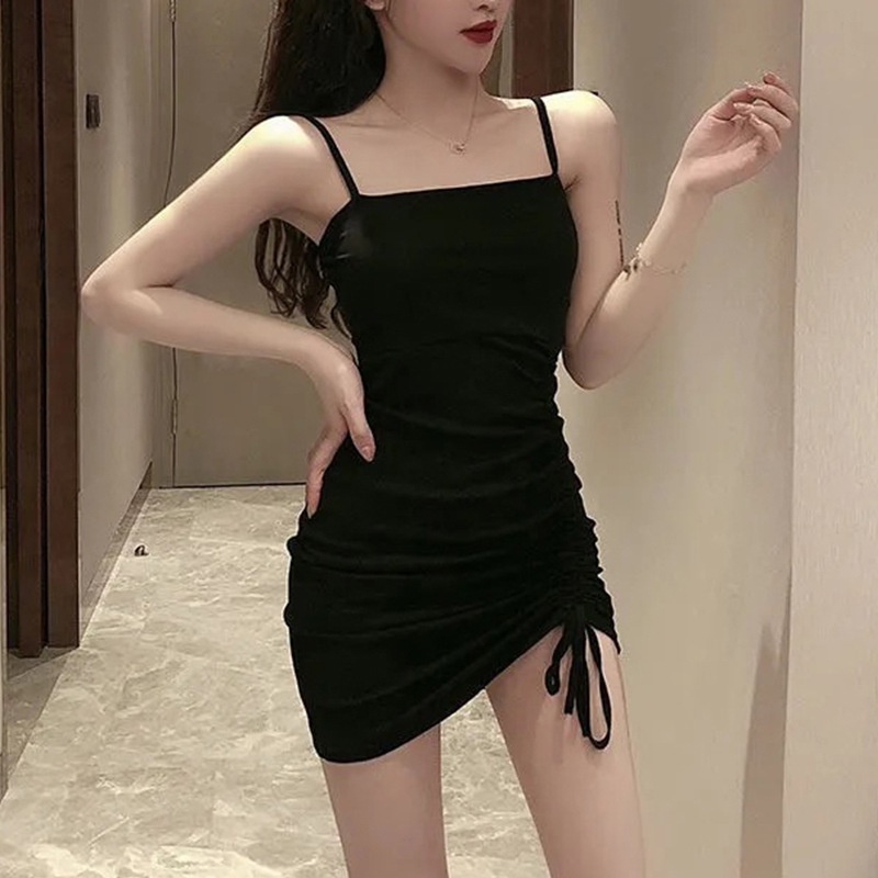性感一字肩黑色吊带连衣裙女夏新款修身抽绳显瘦包臀短裙子潮