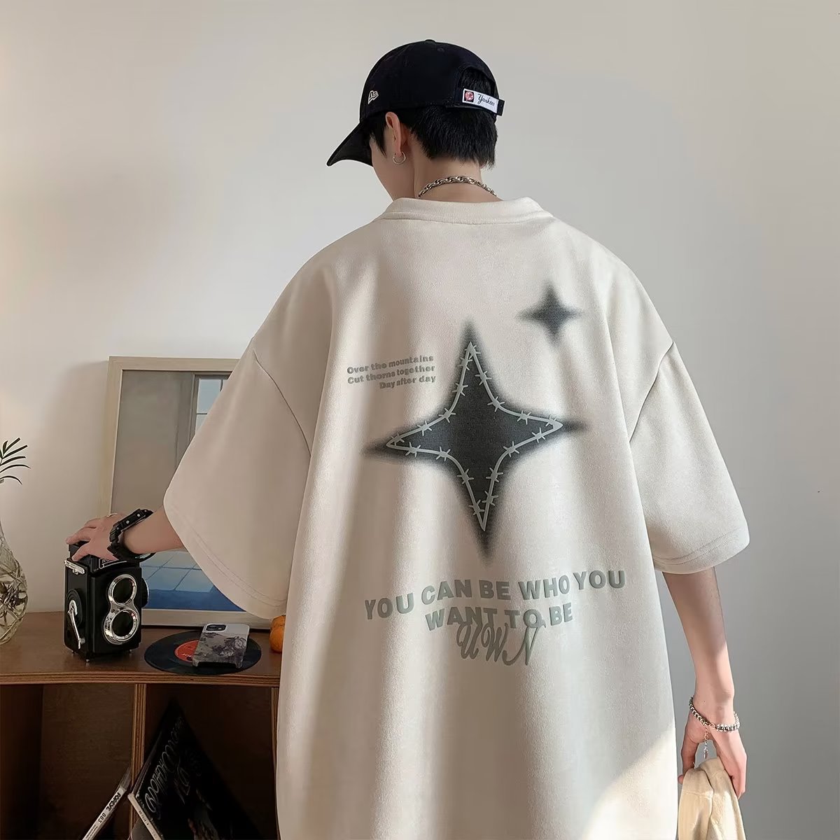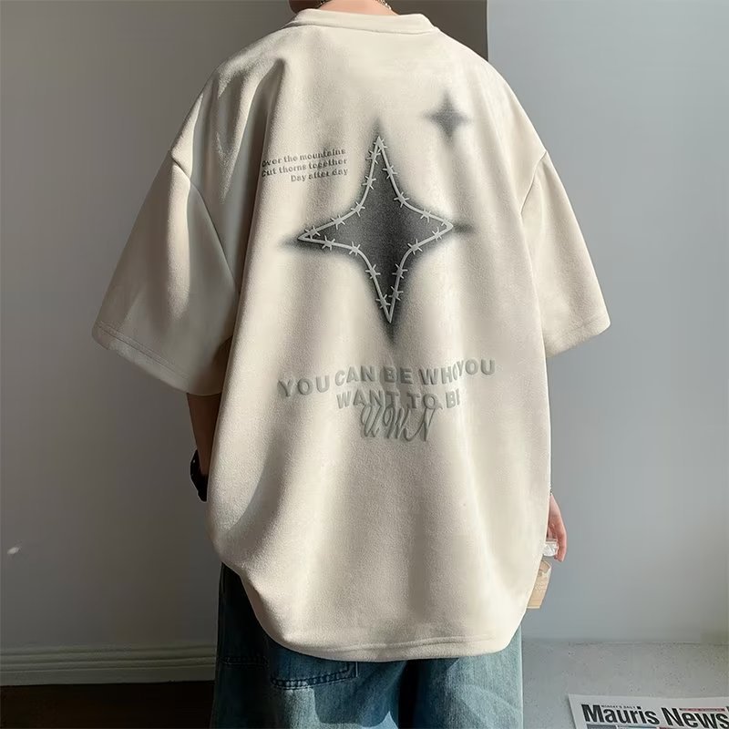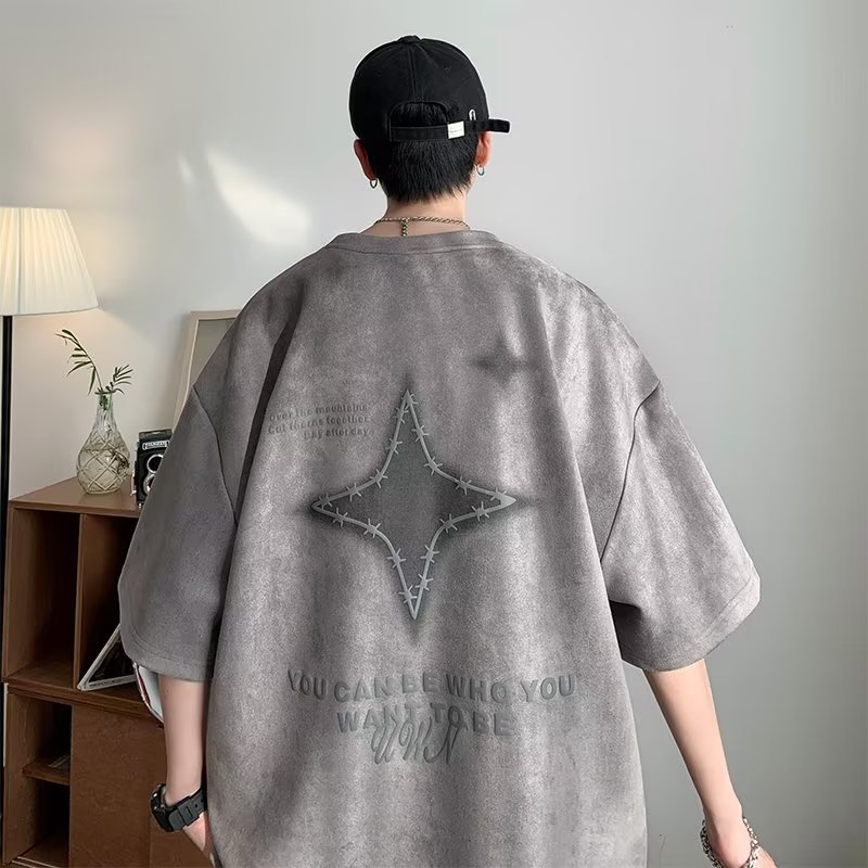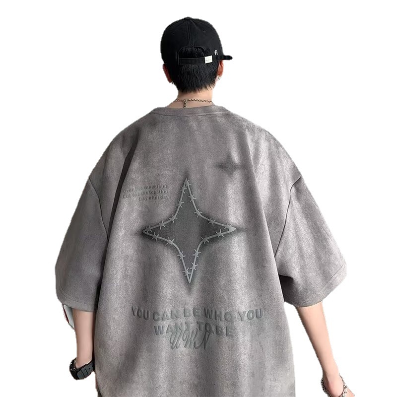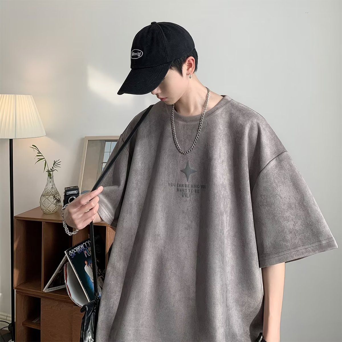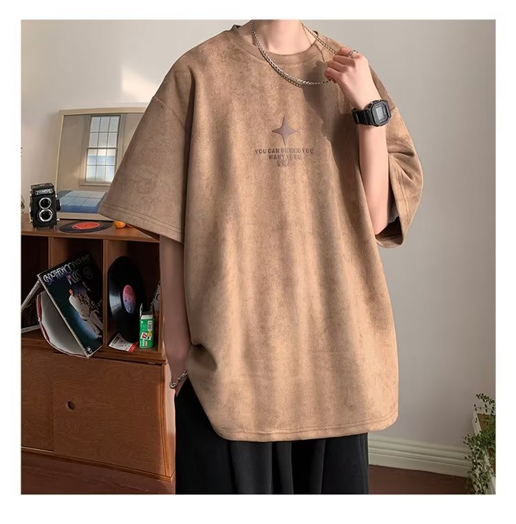 麂皮绒短袖t恤男夏季美式复古宽松休闲上衣潮牌潮流高街半袖体恤