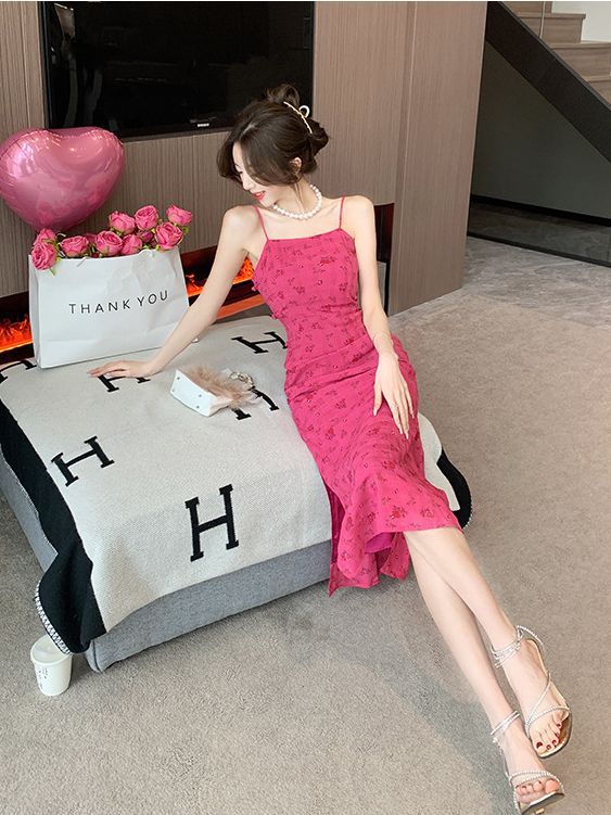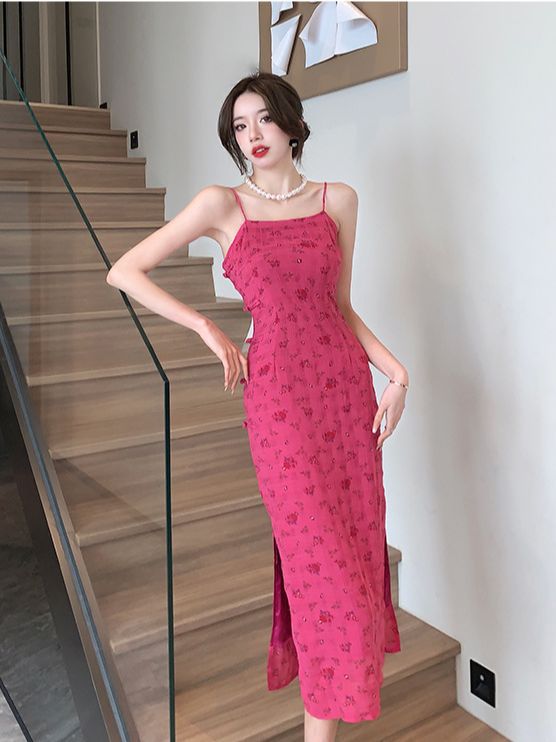 夏季新款高品质复古国风女人味吊带连衣裙女改良花色旗袍扣长裙女