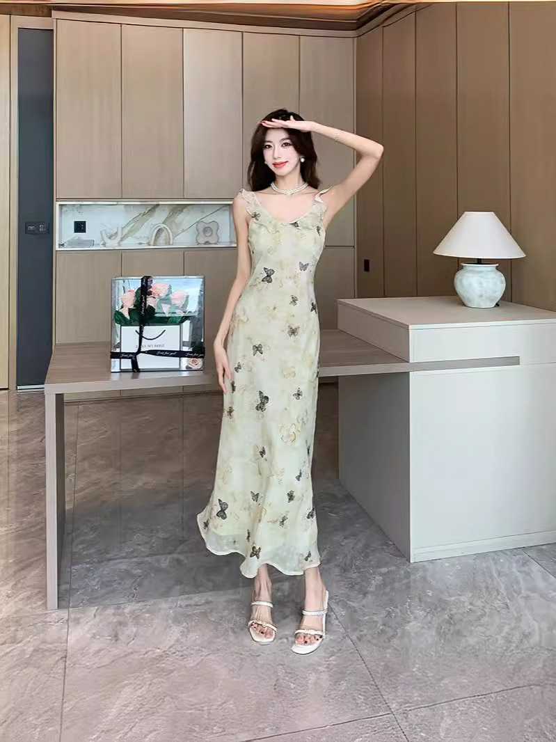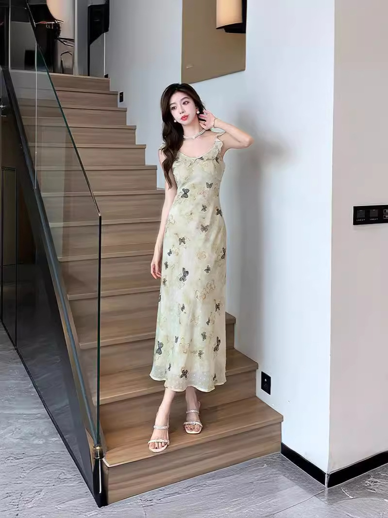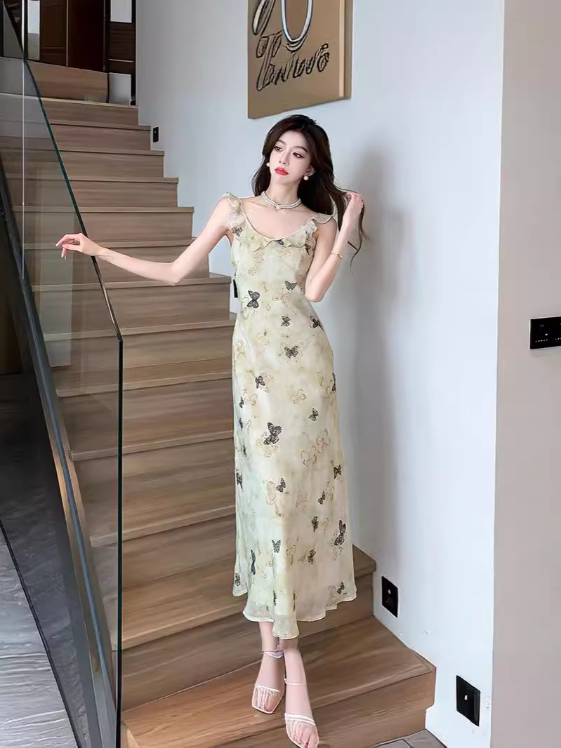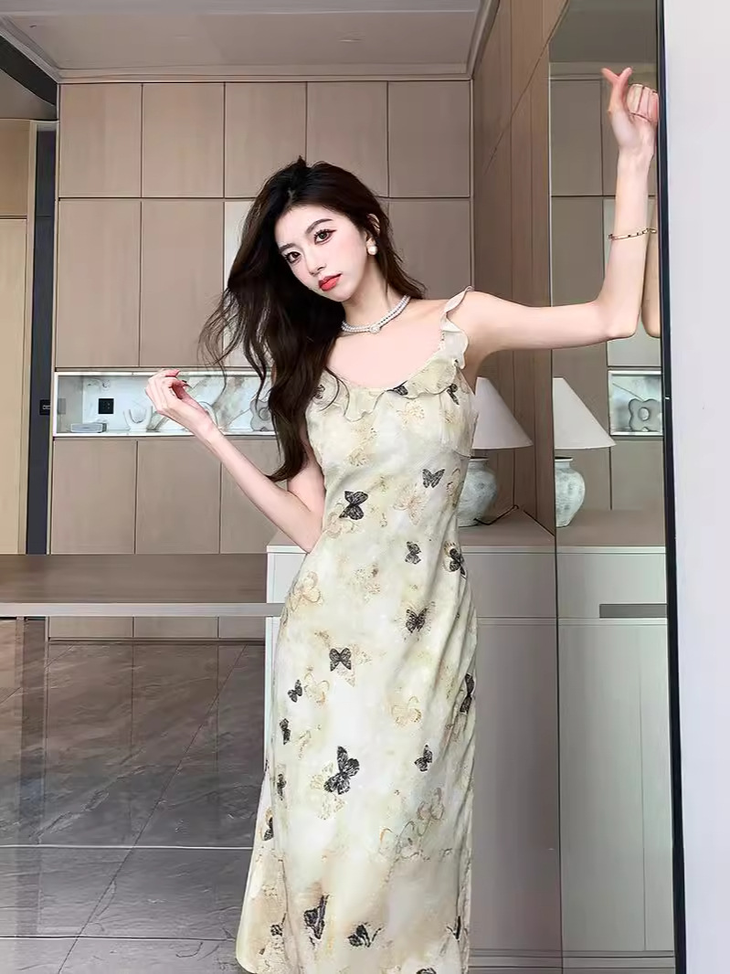 法式春夏高品质新款木耳边气质蝴蝶印花显瘦日常百搭吊带连衣裙子