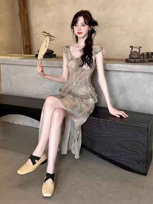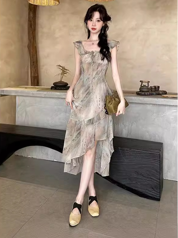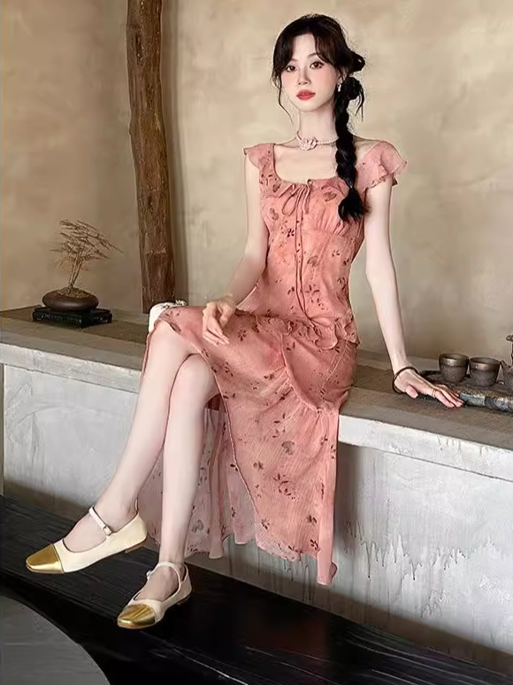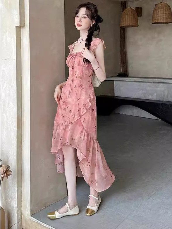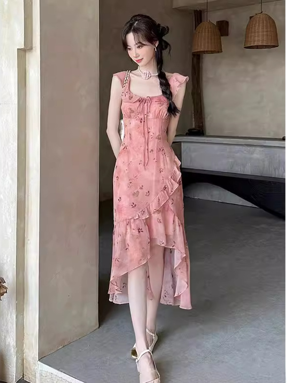 法式甜美气质碎花荷叶边设计不规则收腰显瘦连衣裙女夏季