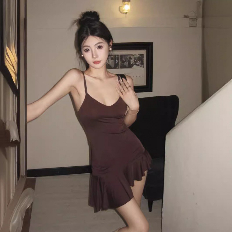 美式辣妹设计感不规则短裙弹力修身短款吊带连衣裙纯色百褶短裙