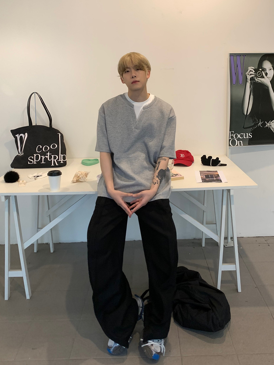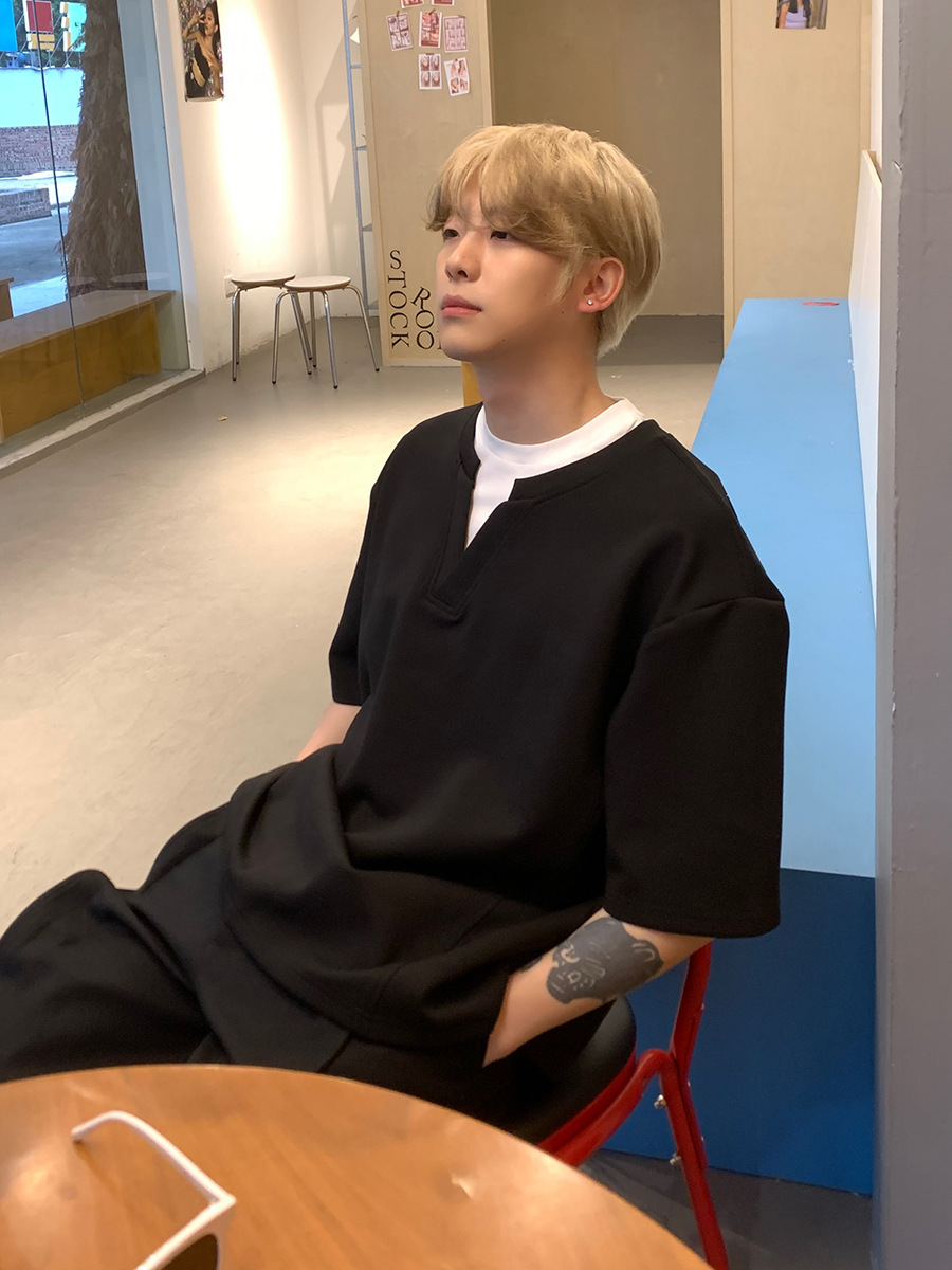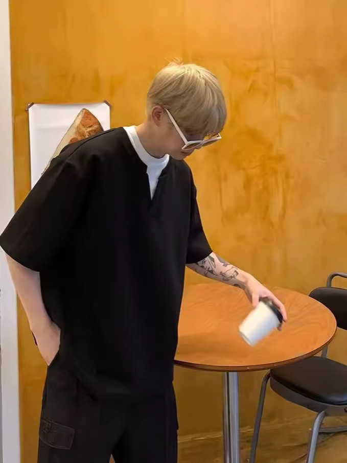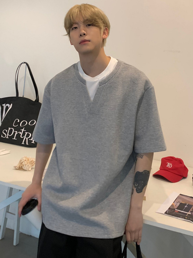 港风纯棉t恤设计感假两件V领短袖T恤男宽松夏季韩风简约百搭半袖