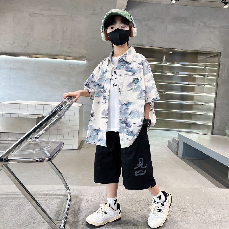 男童国风短袖衬衫三件套2025新款中大童新中式儿童潮流夏款短裤潮