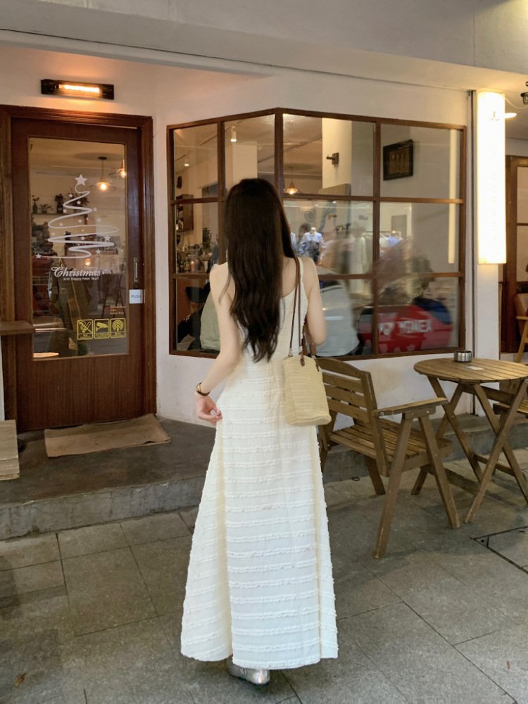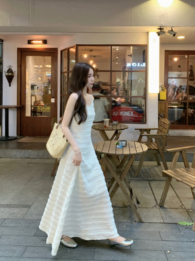 温柔风法式气质V领蕾丝连衣裙女装夏季简约百搭吊带长裙A字裙
