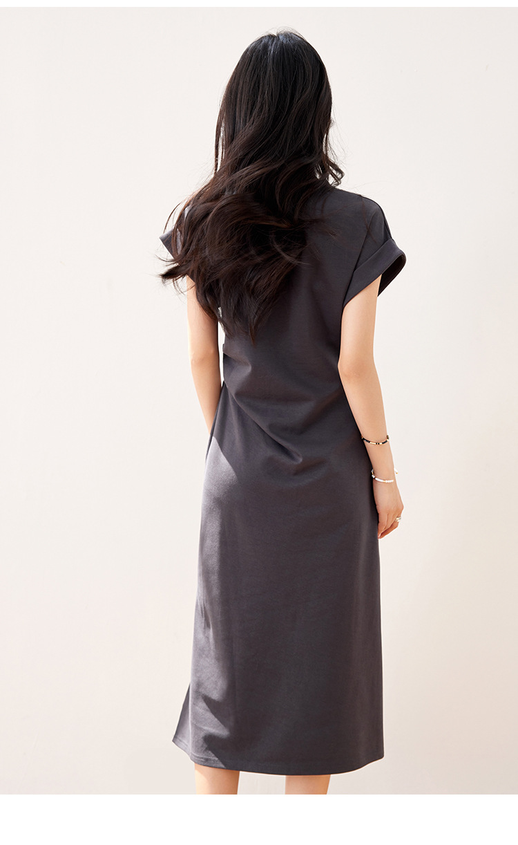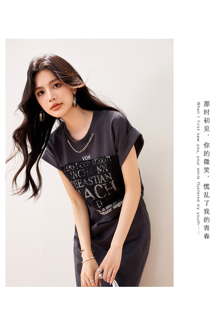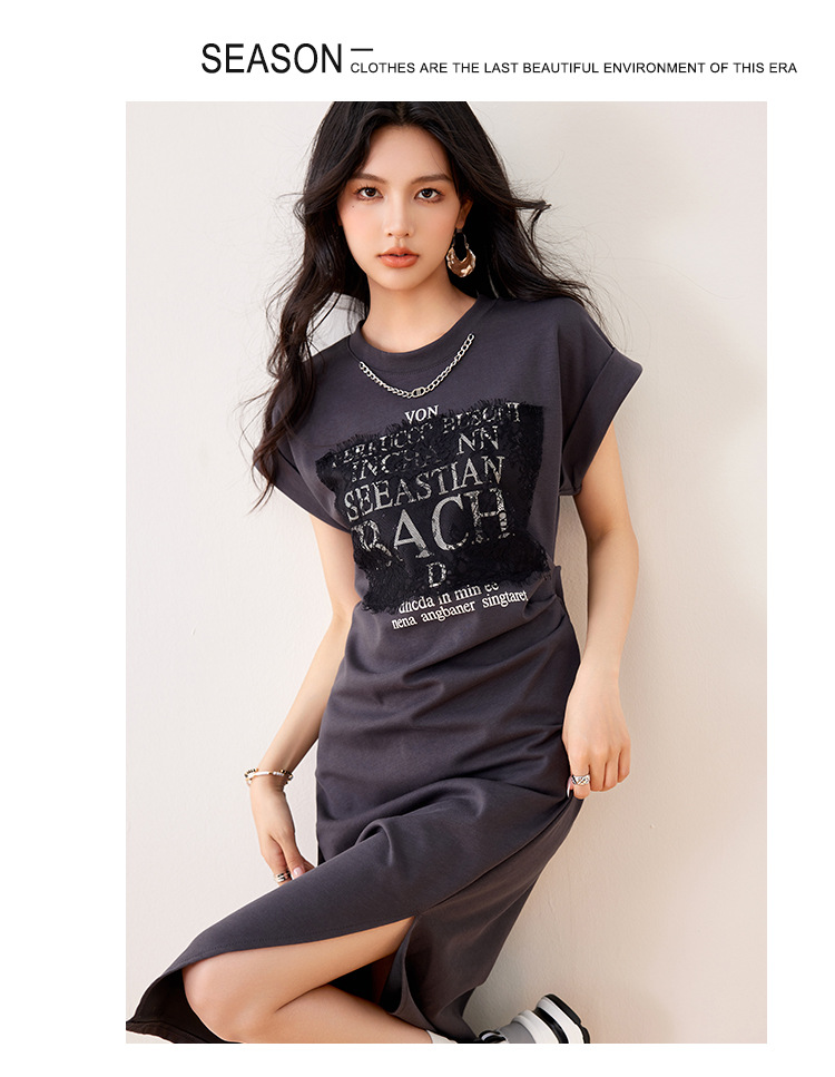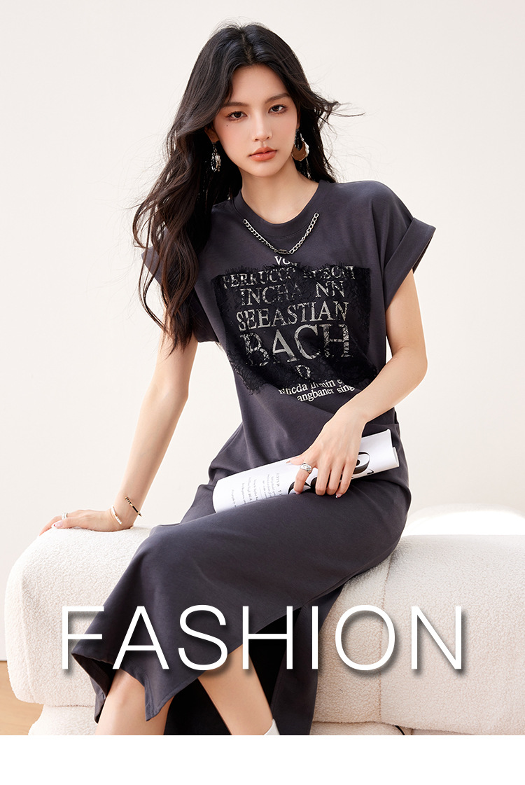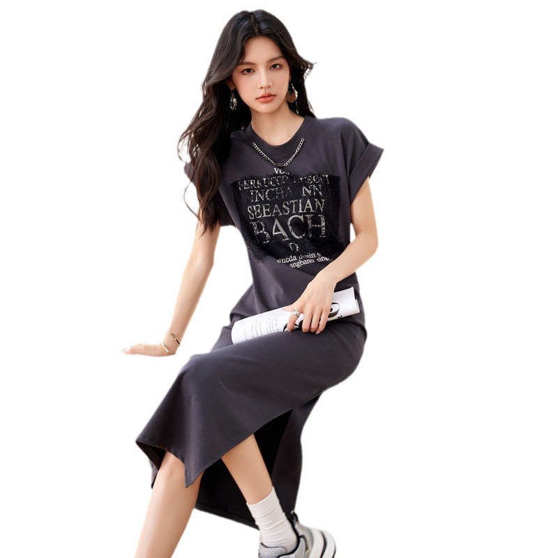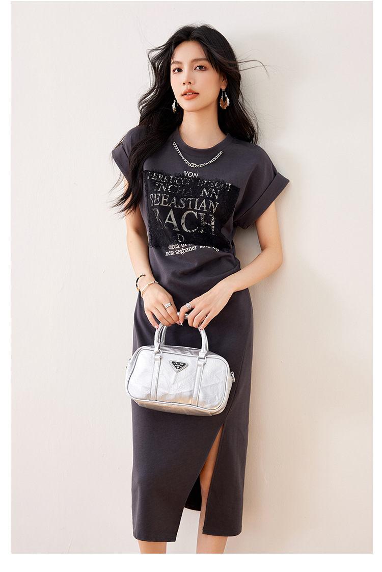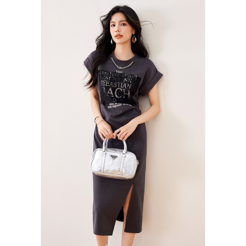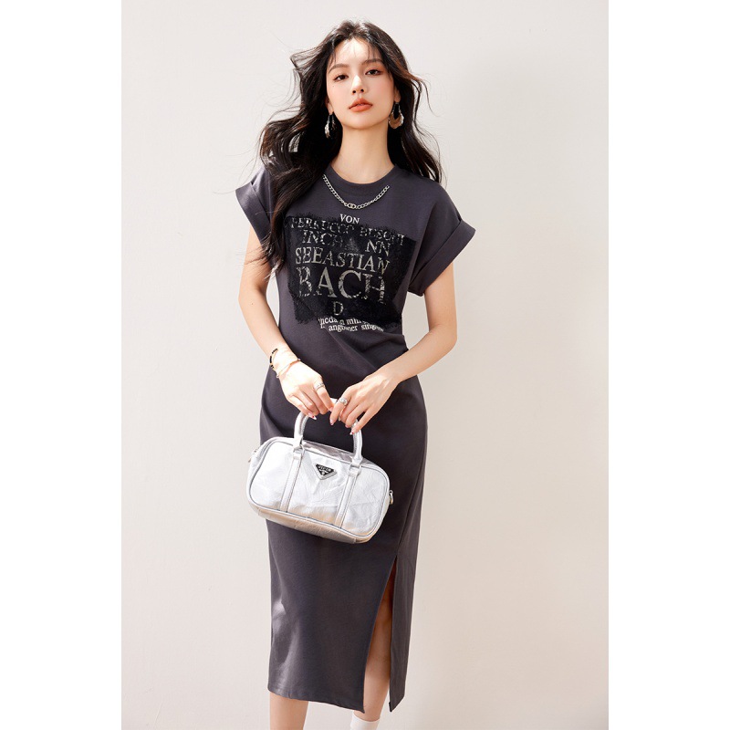 美式复古印花气质连衣裙女夏季高级感收腰显瘦开叉长裙