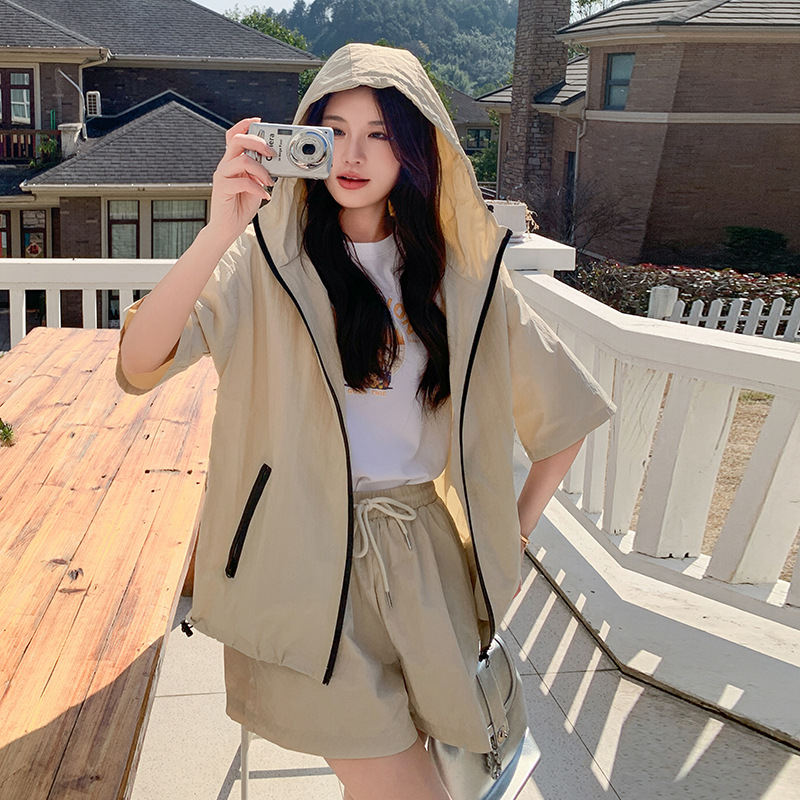 夏季新款简约时尚休闲运动风短款套装防紫外线阳晒连帽两件套