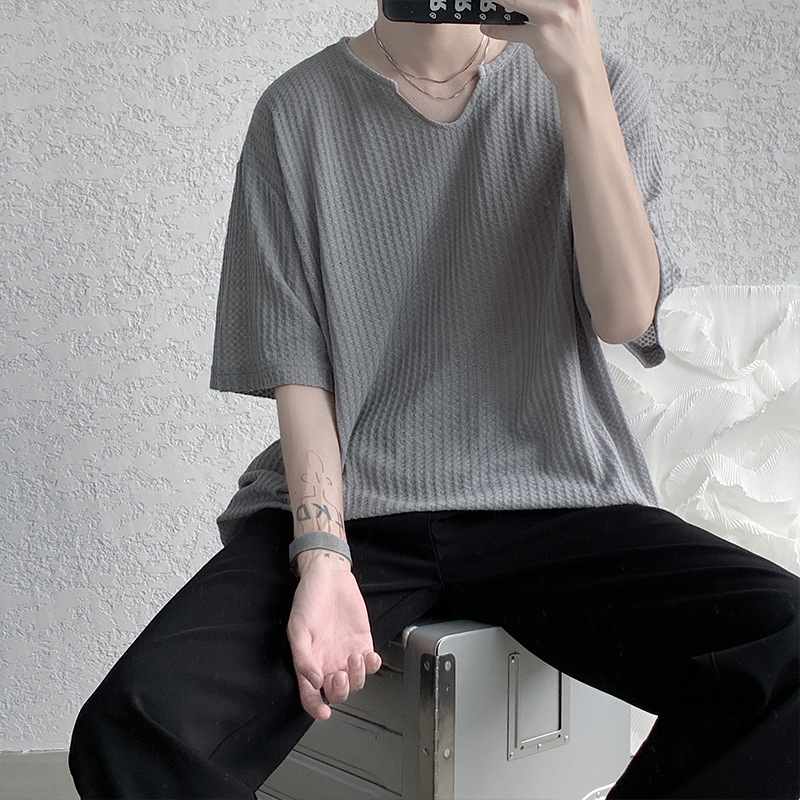 华夫格t恤设计感小众情侣装短袖男春夏季潮流百搭高级感v领打底衫