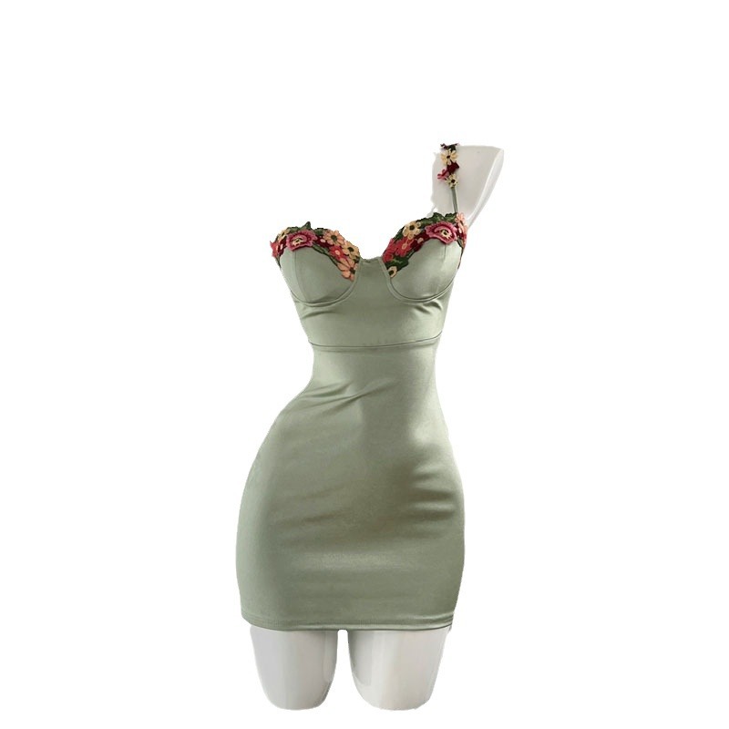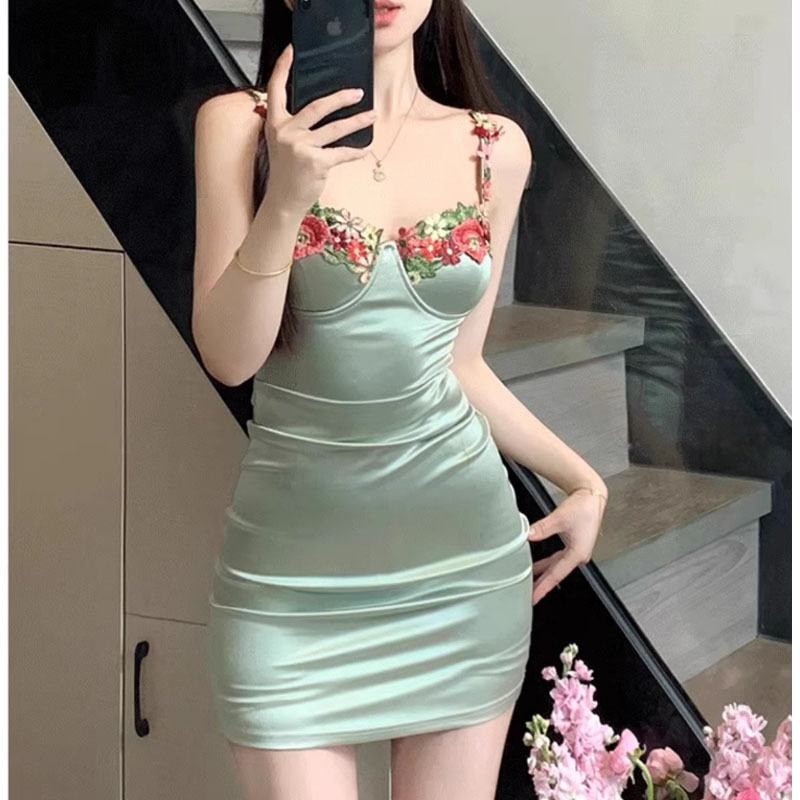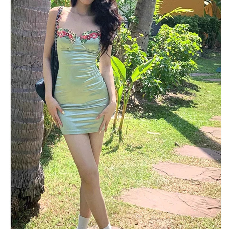 美式辣妹绿色花朵刺绣吊带连衣裙女 夏季多巴胺收腰显瘦A字裙