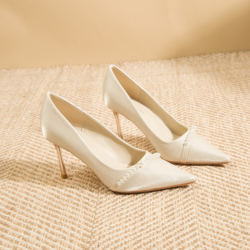新款法式婚鞋新娘鞋女小众单鞋气质珍珠高跟鞋伴娘鞋