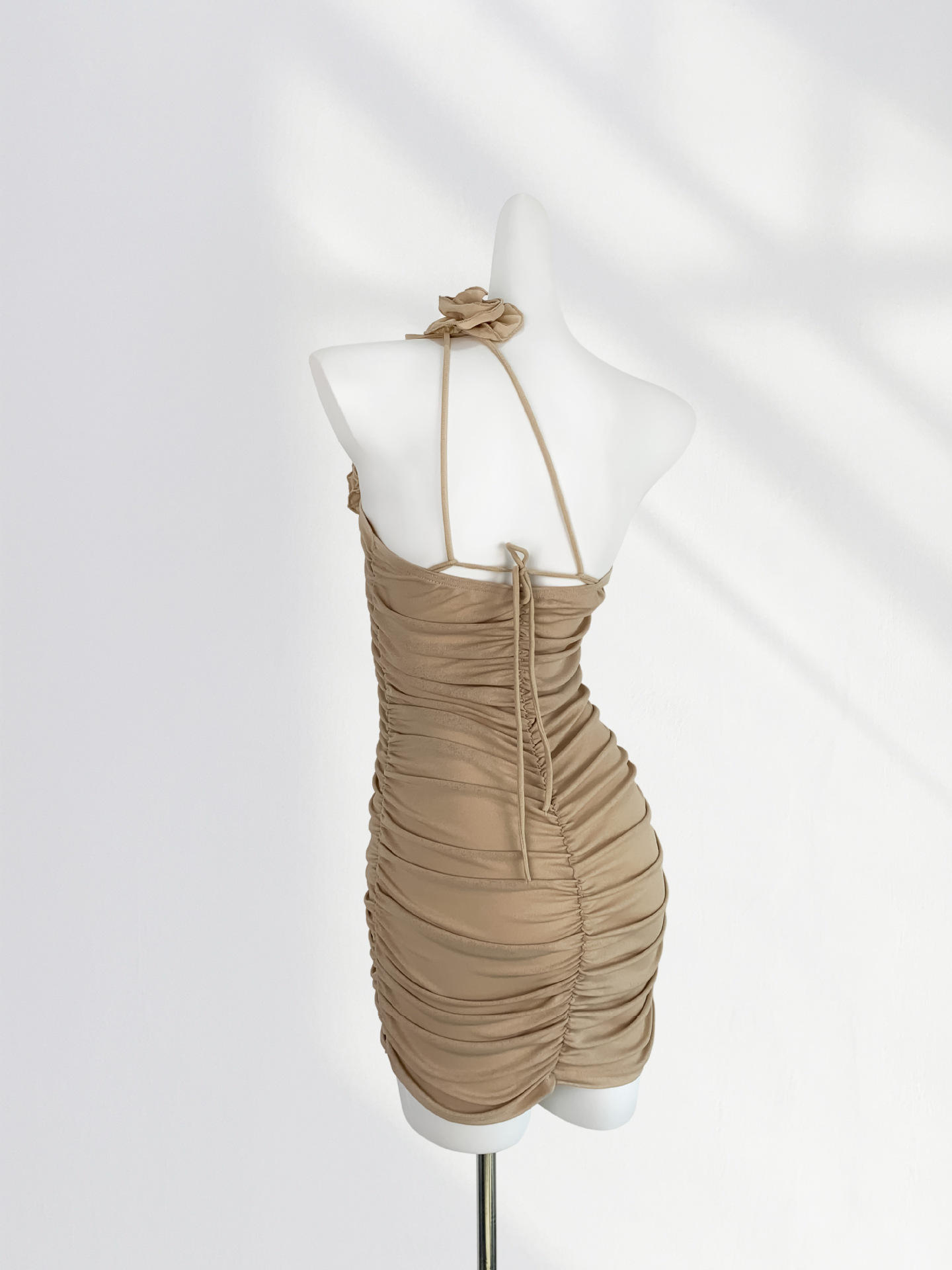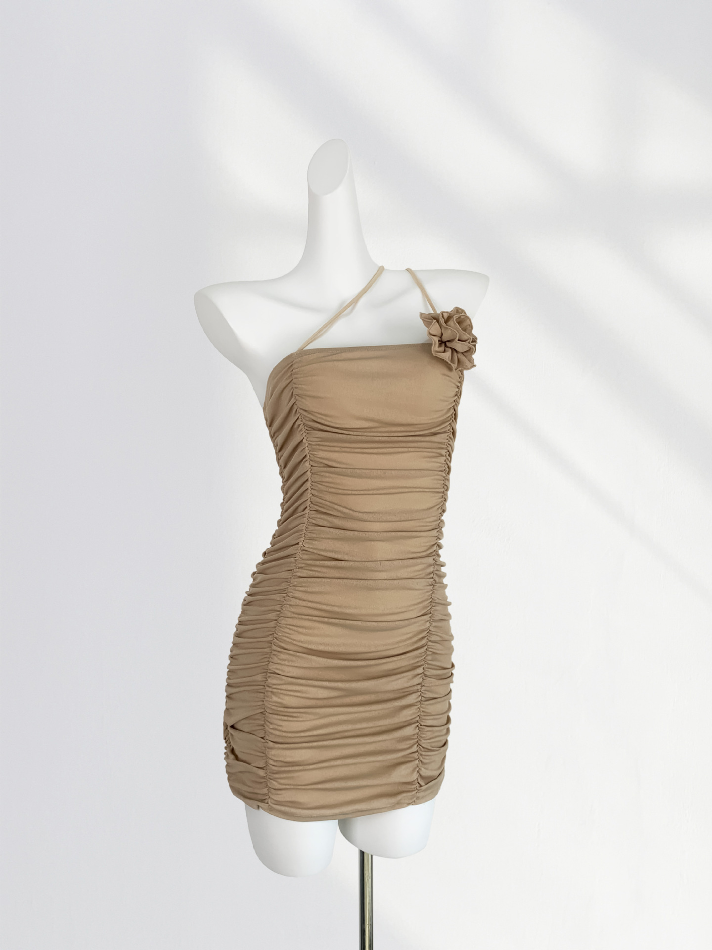 巨好看 玫瑰花装饰吊带连衣裙女夏紧身褶皱热辣美式性感包臀裙子