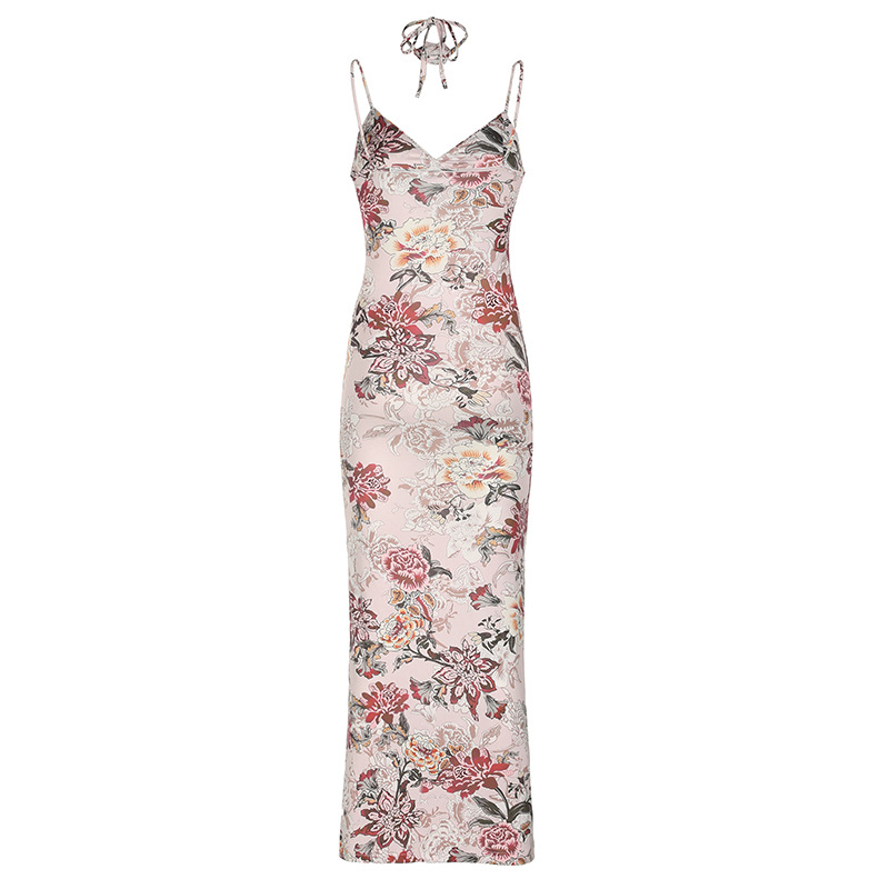 法式轻熟印花度假风V领吊带裙春时尚性感女人修身长款连衣裙