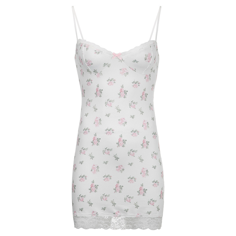 小碎花撞色蕾丝拼接性感低胸纯欲风吊带包臀连衣裙短裙女