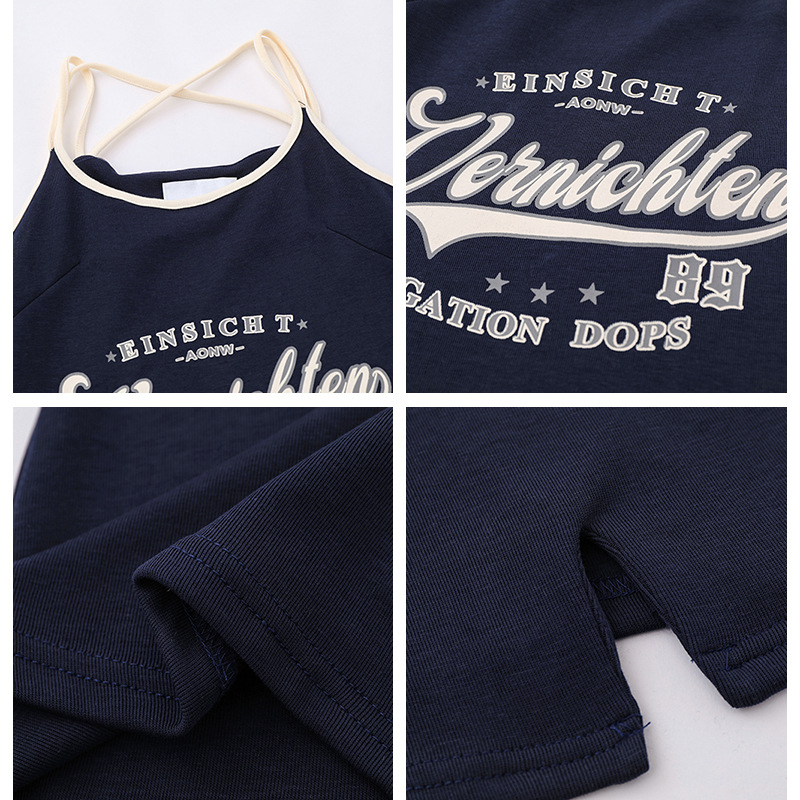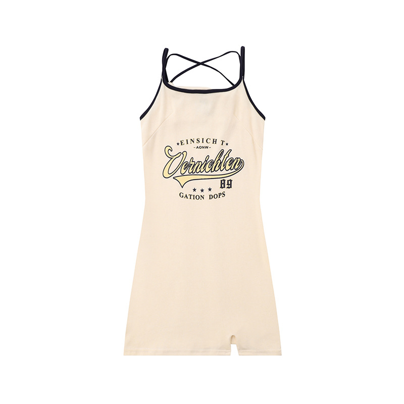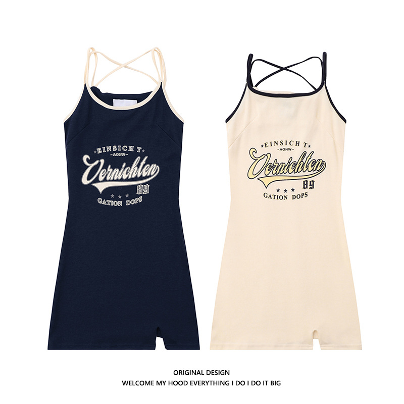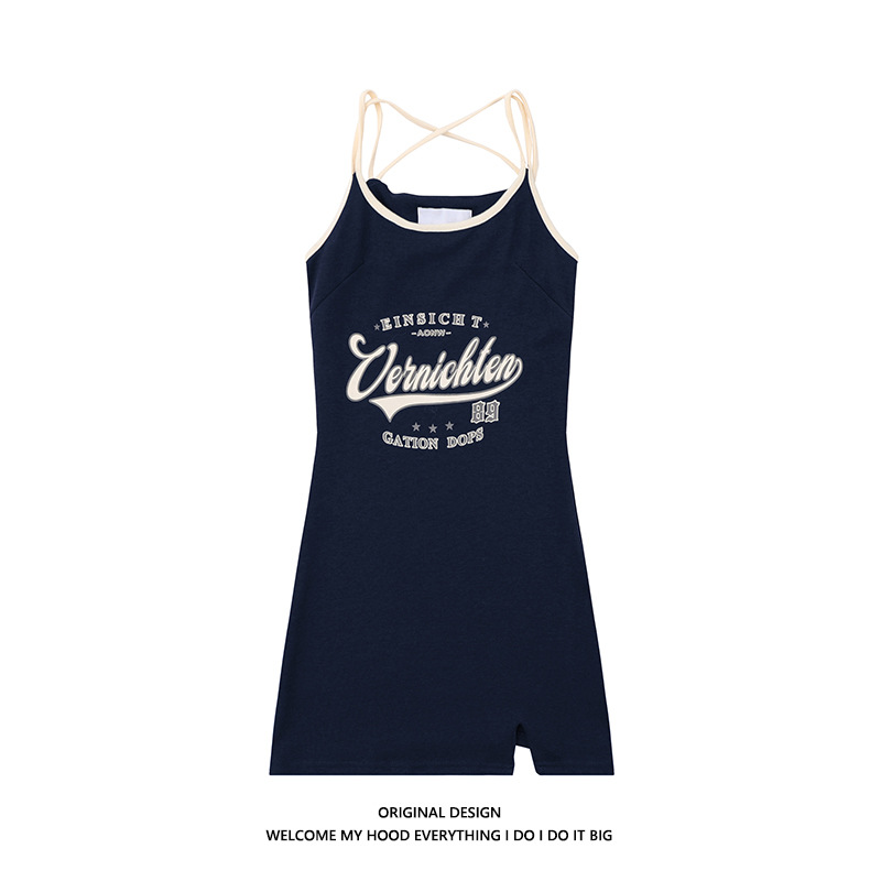 美式复古字母印花学院风吊带连衣裙女气质收腰开叉运动包臀短裙子