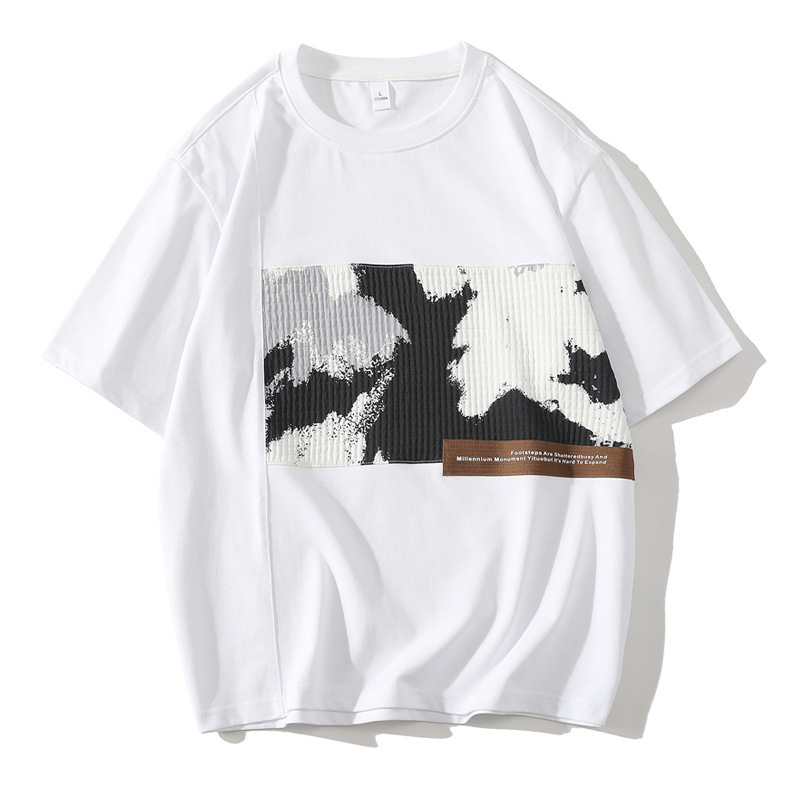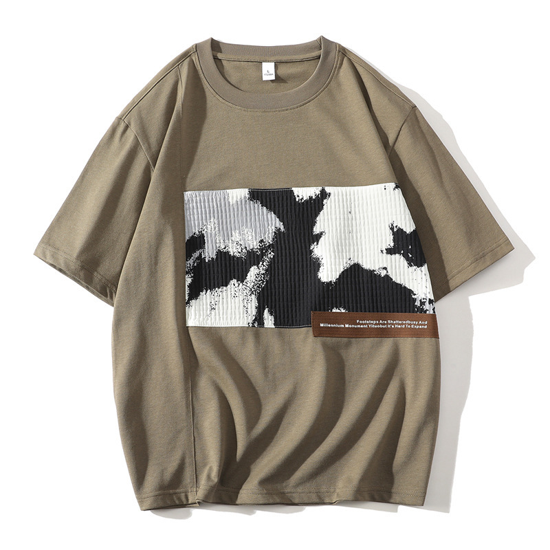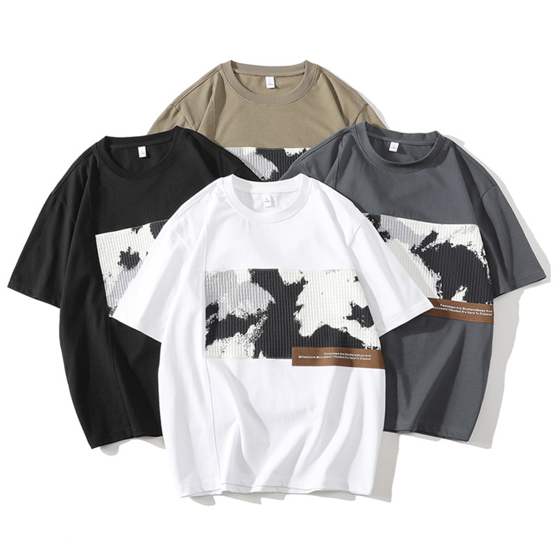 250g重磅纯棉假两件短袖t恤男宽松日系潮牌拼接拼色圆领男士上衣