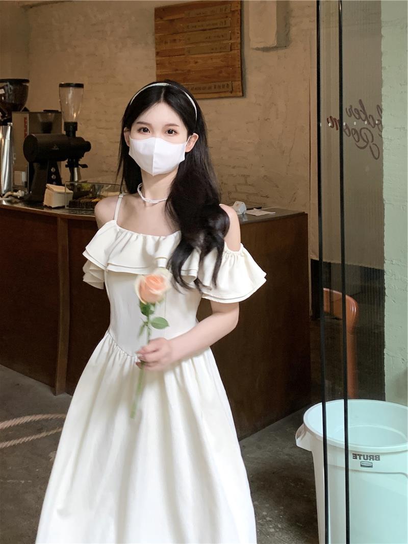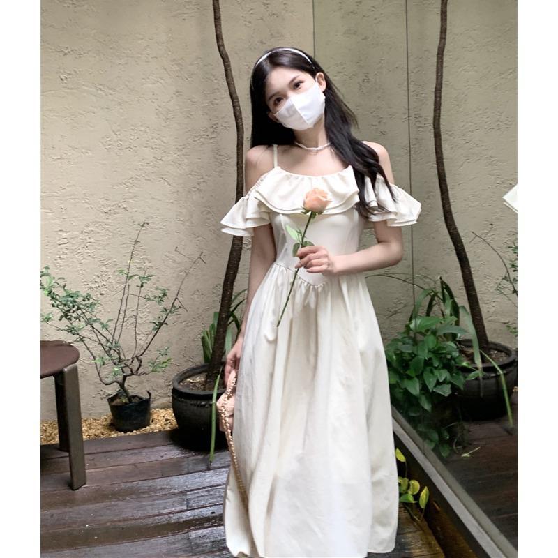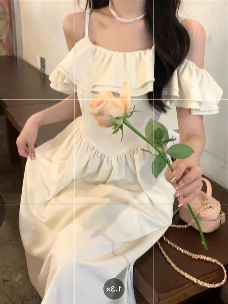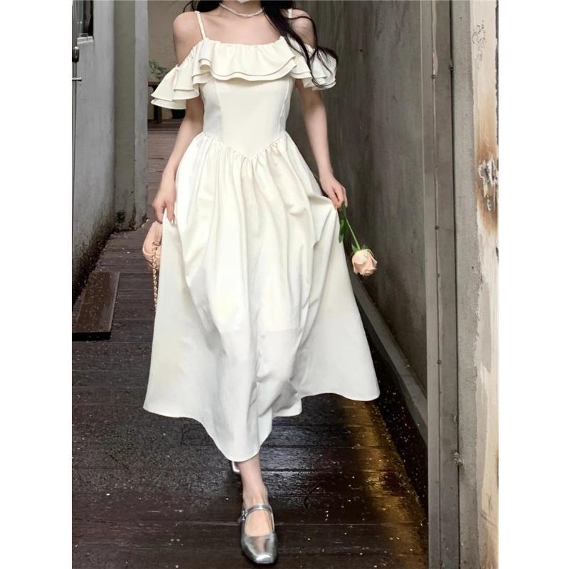 一字肩白色吊带裙韩系极简风收腰显瘦连衣裙设计感荷边叶露肩裙子