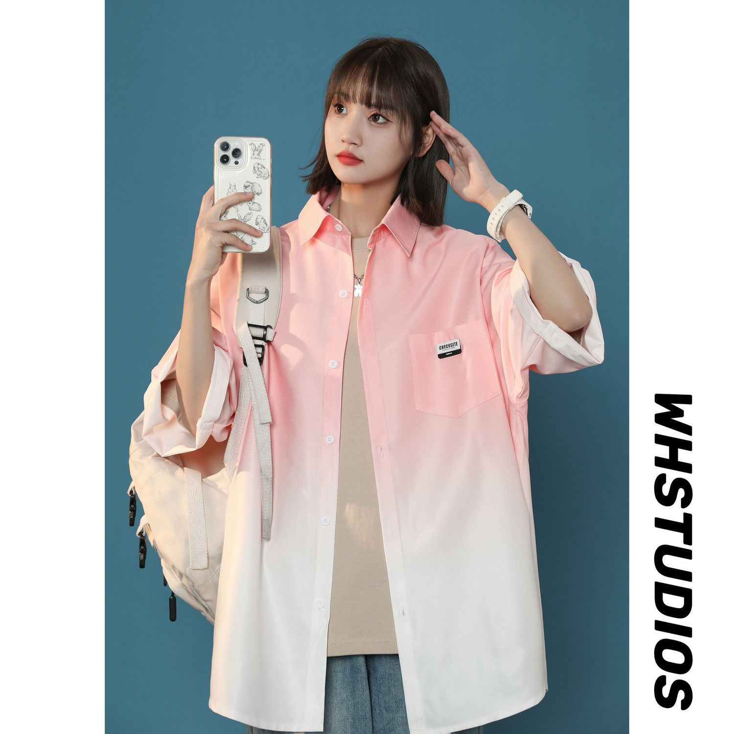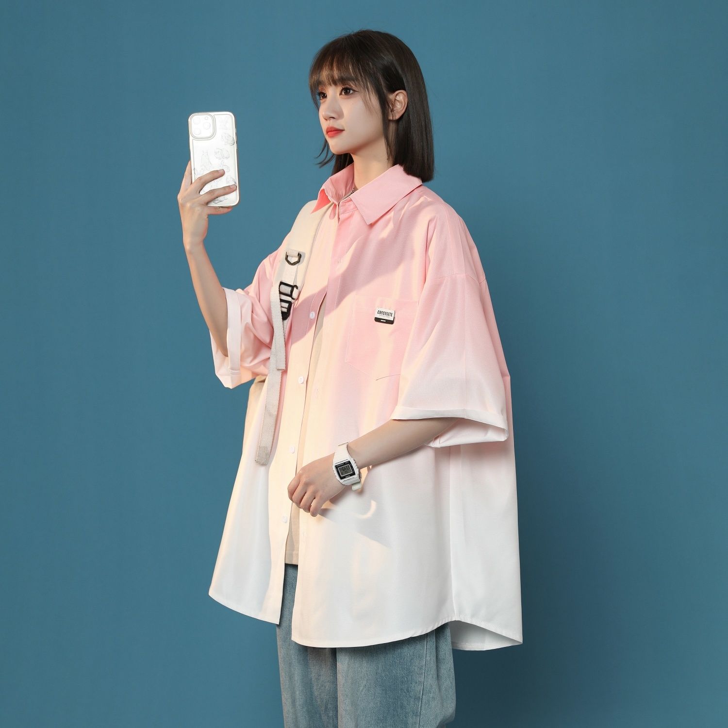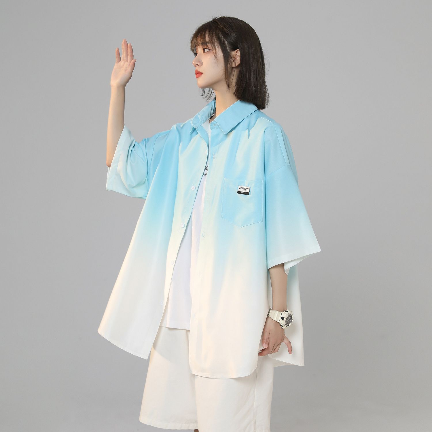 黑白渐变色衬衫男短袖春季高级感冰丝衬衣六七分袖防晒外套情侣装