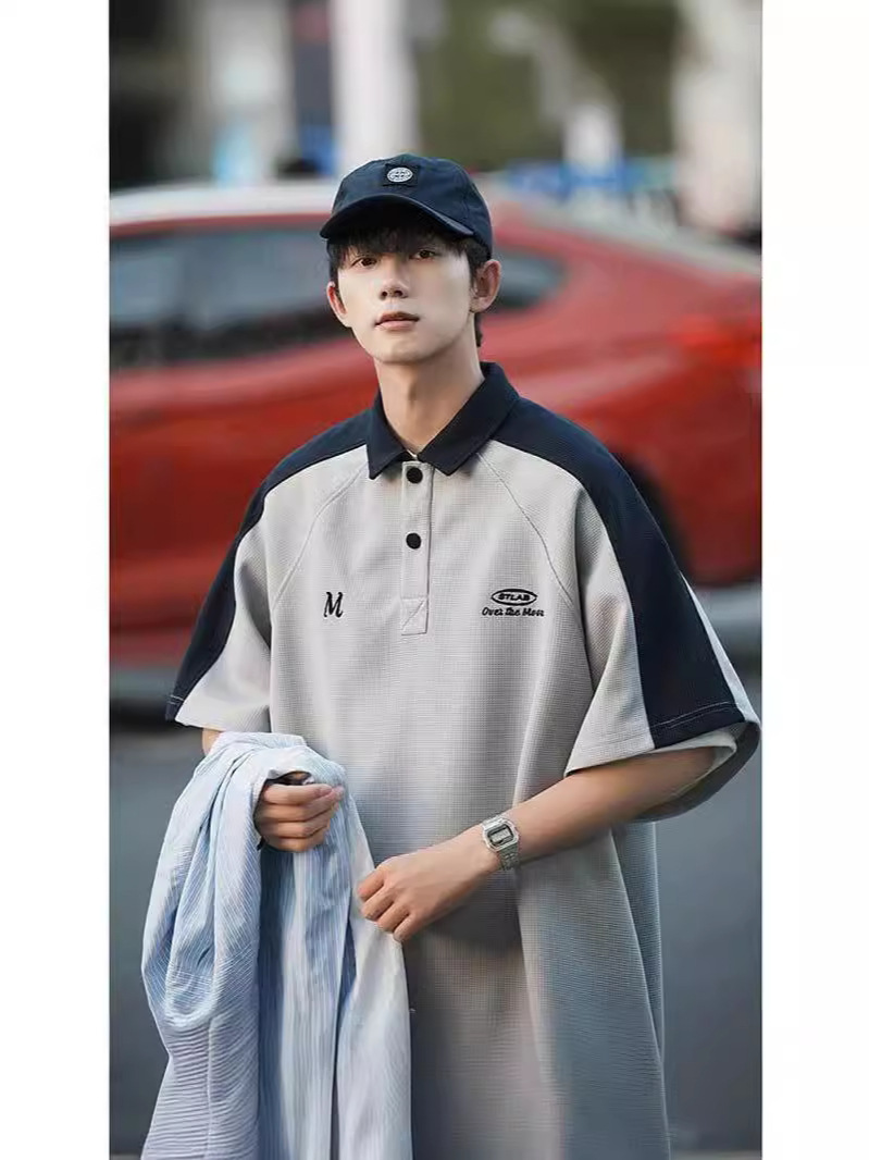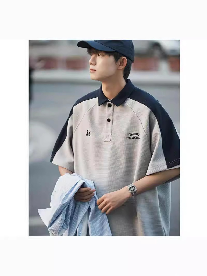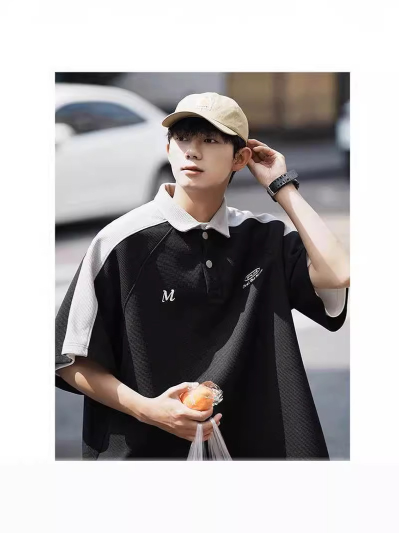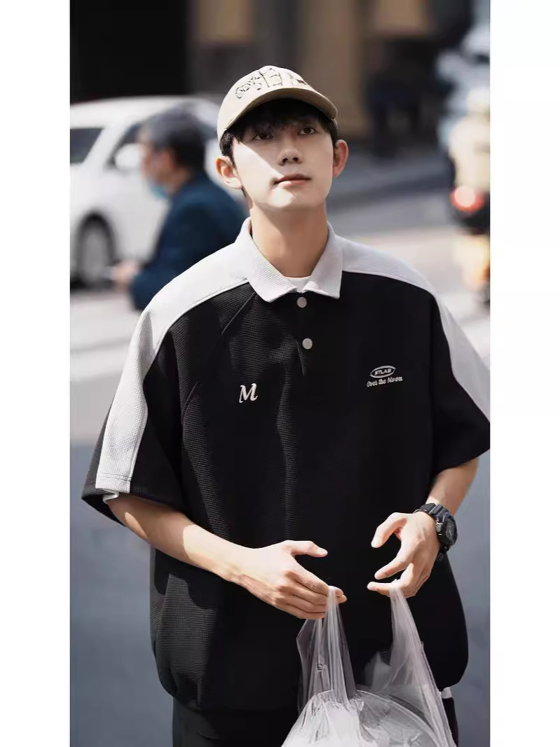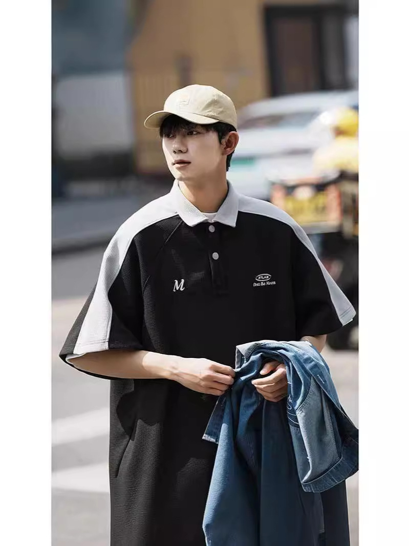 新品华夫格Polo衫男夏季美式复古撞色短袖t恤宽松潮牌休闲五分袖