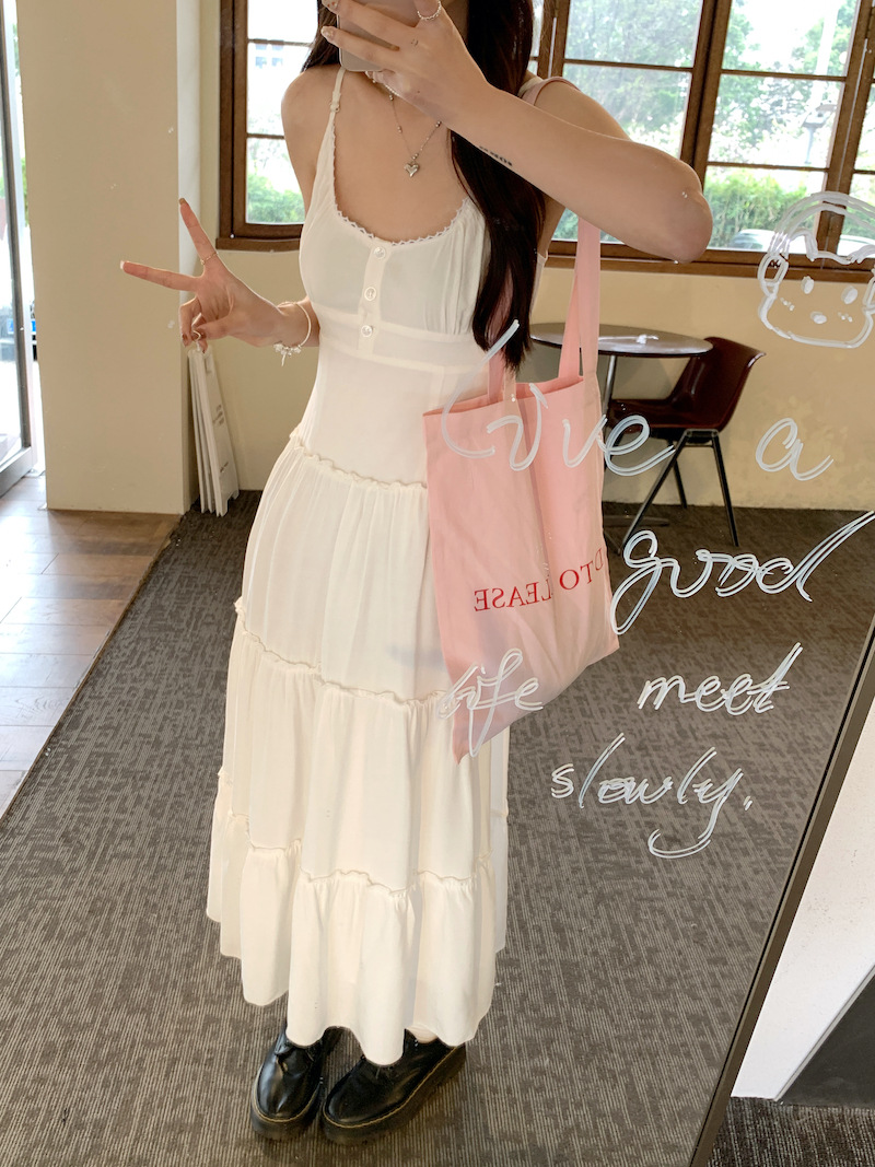 法式挂脖吊带连衣裙新款女夏季高级感气质显瘦露腰过膝长裙子