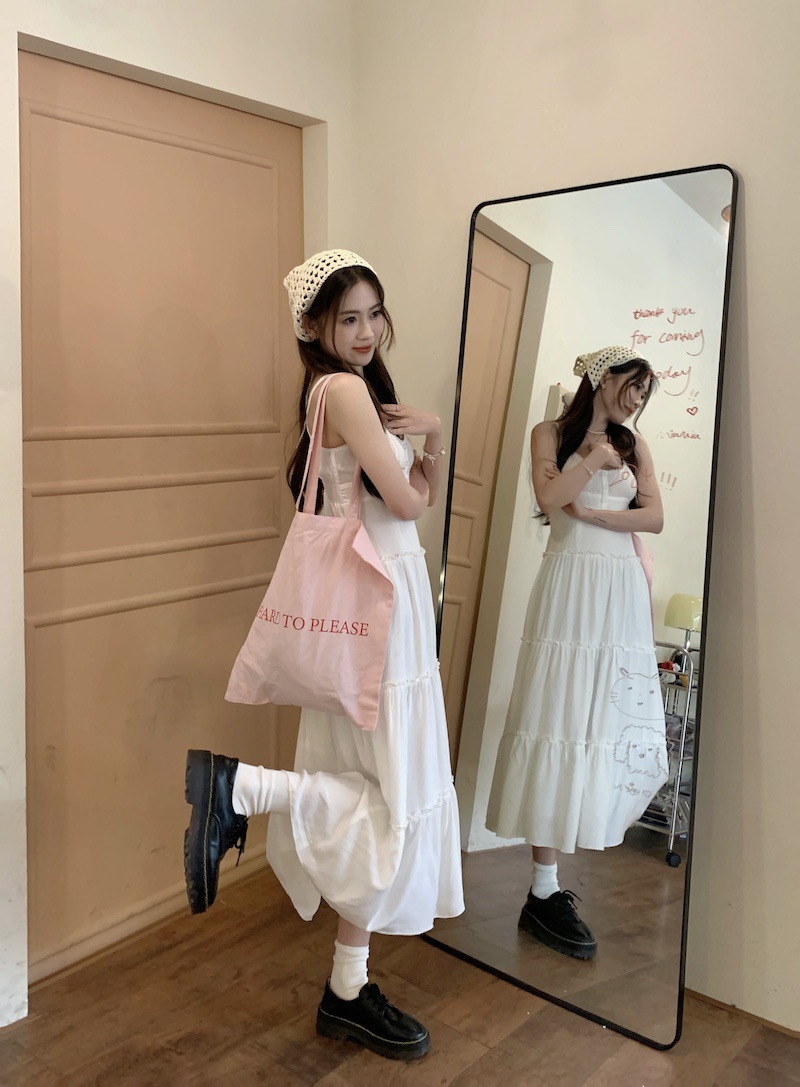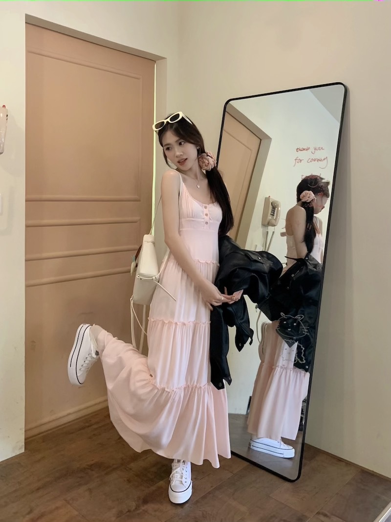 粉色吊带连衣裙女夏季新款掐腰裙小个子法式温柔风a字裙长裙