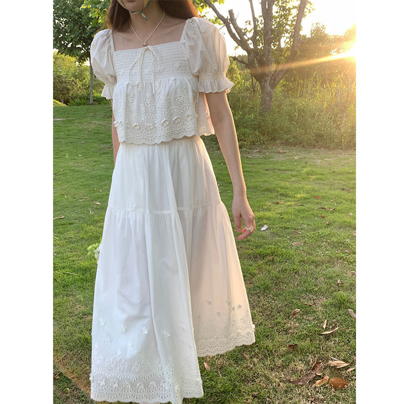重工DING面料立体花镂空刺绣上衣长裙套装夏季