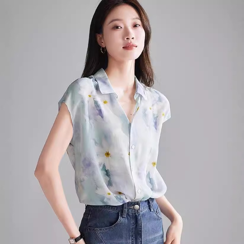 夏季新款印花桑蚕丝小飞袖衬衫女上衣时尚衬衣设计感