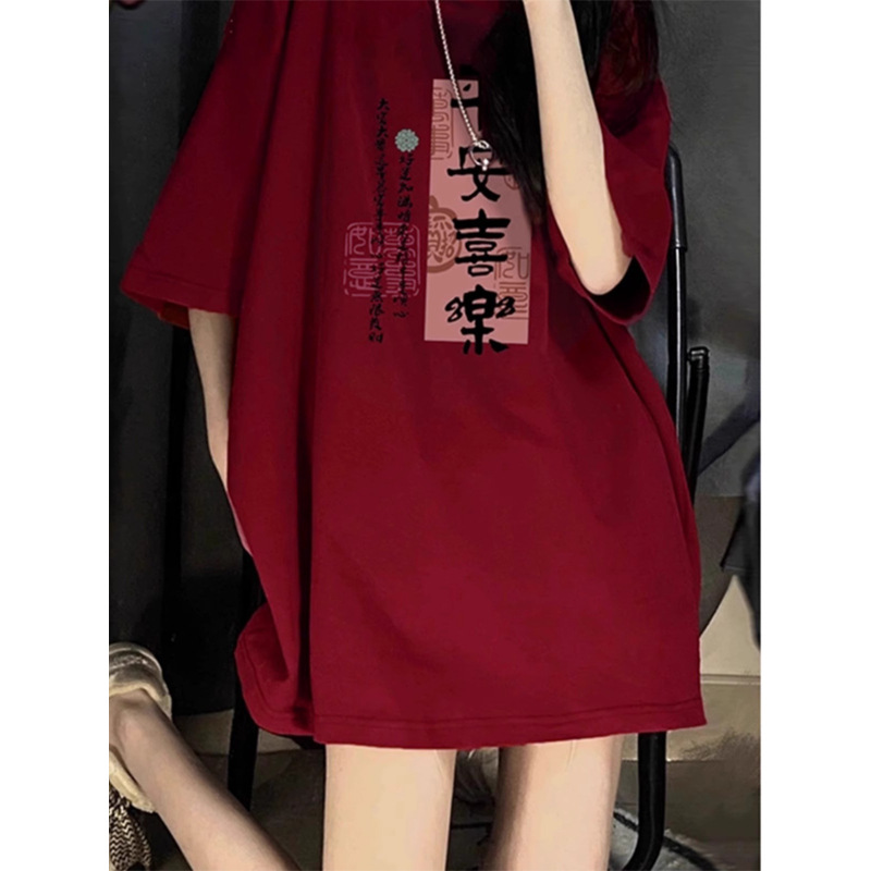 酒红色新年国潮牌纯棉重磅正肩短袖t恤女春夏新款宽松上衣