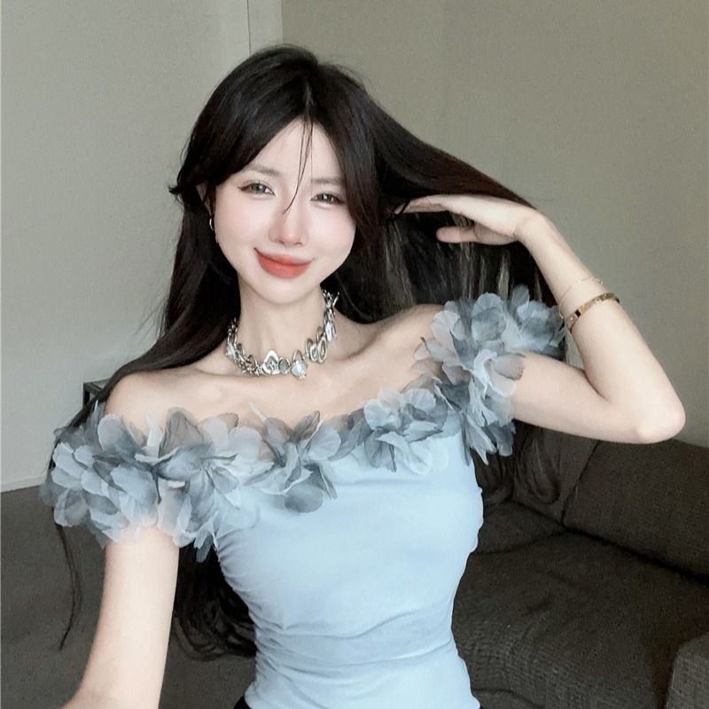 温柔超仙立体花朵一字肩吊带洋派小衫女夏季纯欲性感显瘦短款上衣