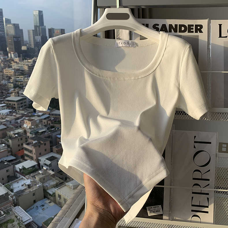正肩螺纹不规则方领t恤女短袖夏季新款修身短款u领设计感小众上衣