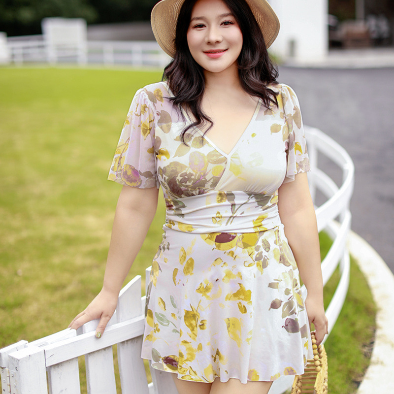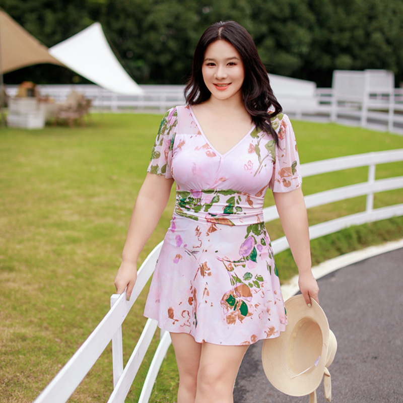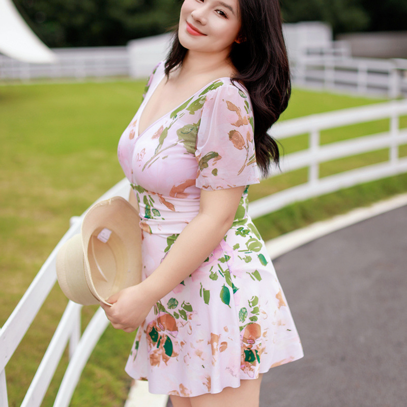 加肥加大温泉游泳衣女连体平角保守显瘦遮肚大码碎花显瘦胖妹泳装