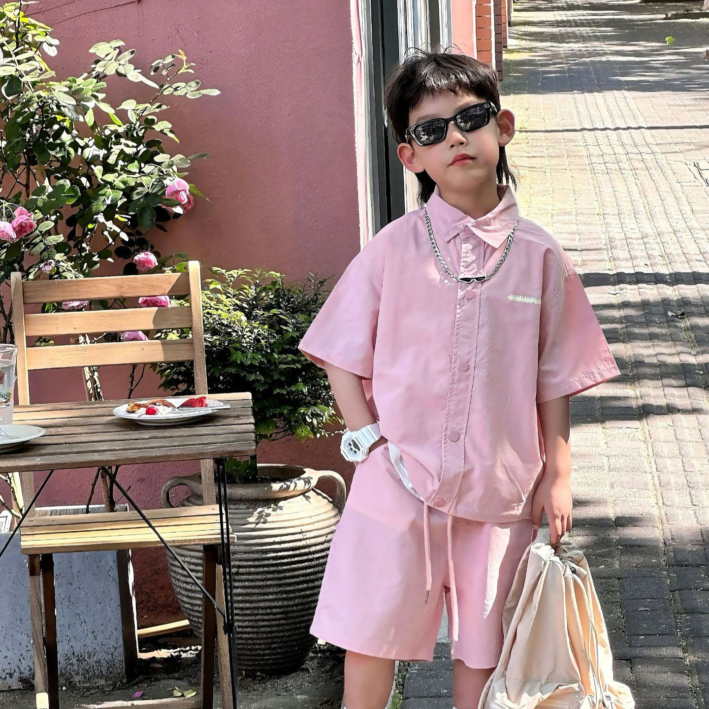 泰如夏季新款韩版男童时尚百搭洋气纯色字母套装儿童上衣短裤