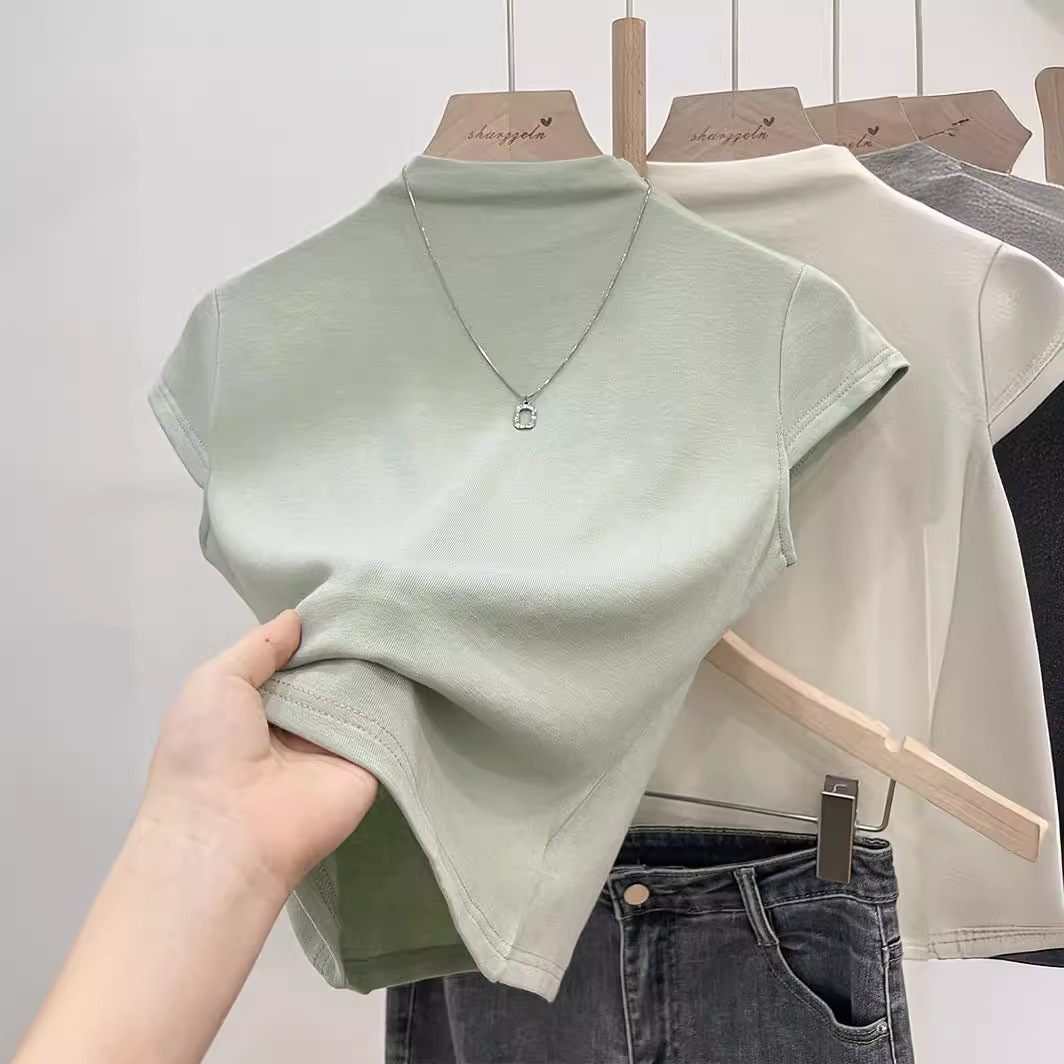 纯棉半高领正肩短袖T恤女 新款气质修身上衣潮内搭基础打底衫