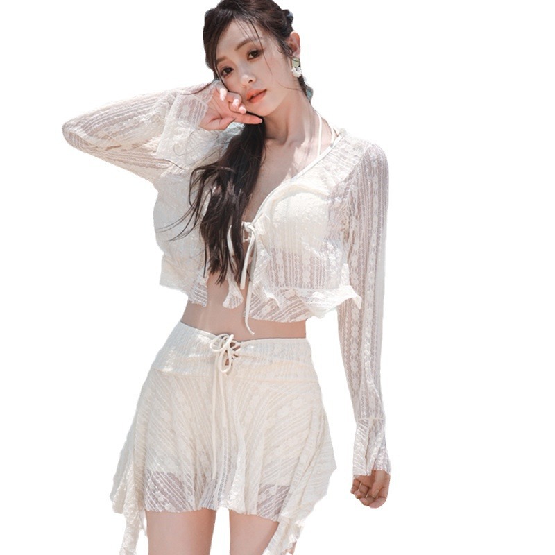 仙气游泳衣女比基尼分体三件套bikini长袖韩国蕾丝温泉度假泳装