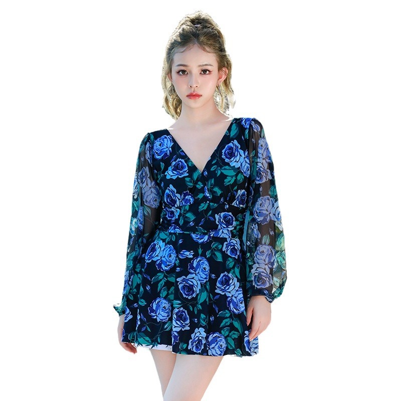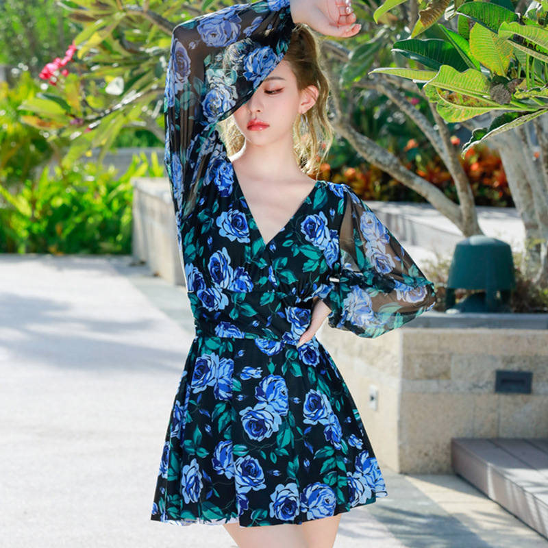 连体平角游泳衣保守显瘦遮肚韩版加肥加大长袖胖妹妹温泉泳装