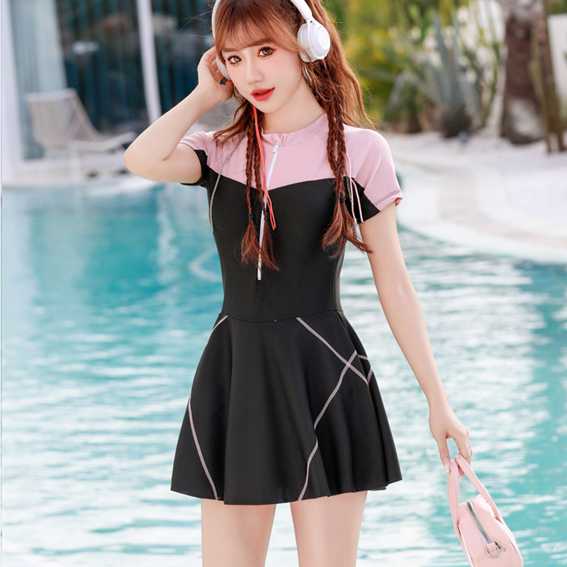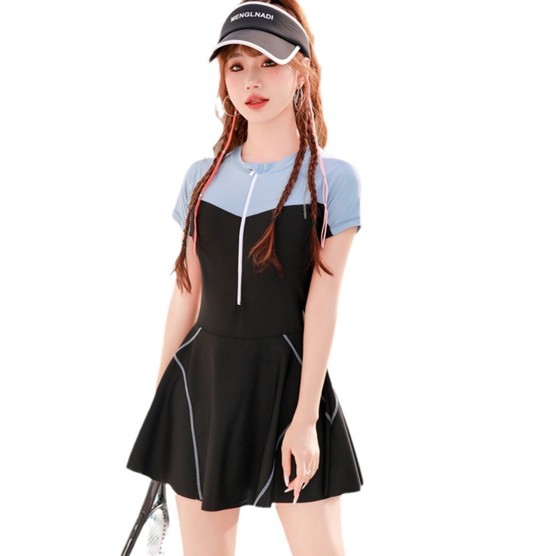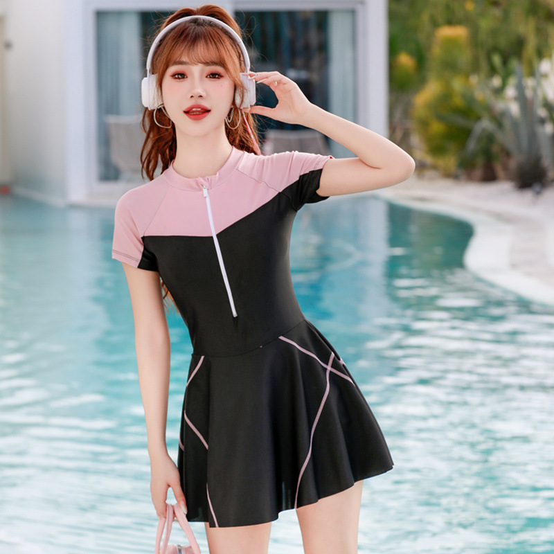 运动游泳衣女连体平角保守显瘦遮肚少女学生大码裙式训练温泉泳装