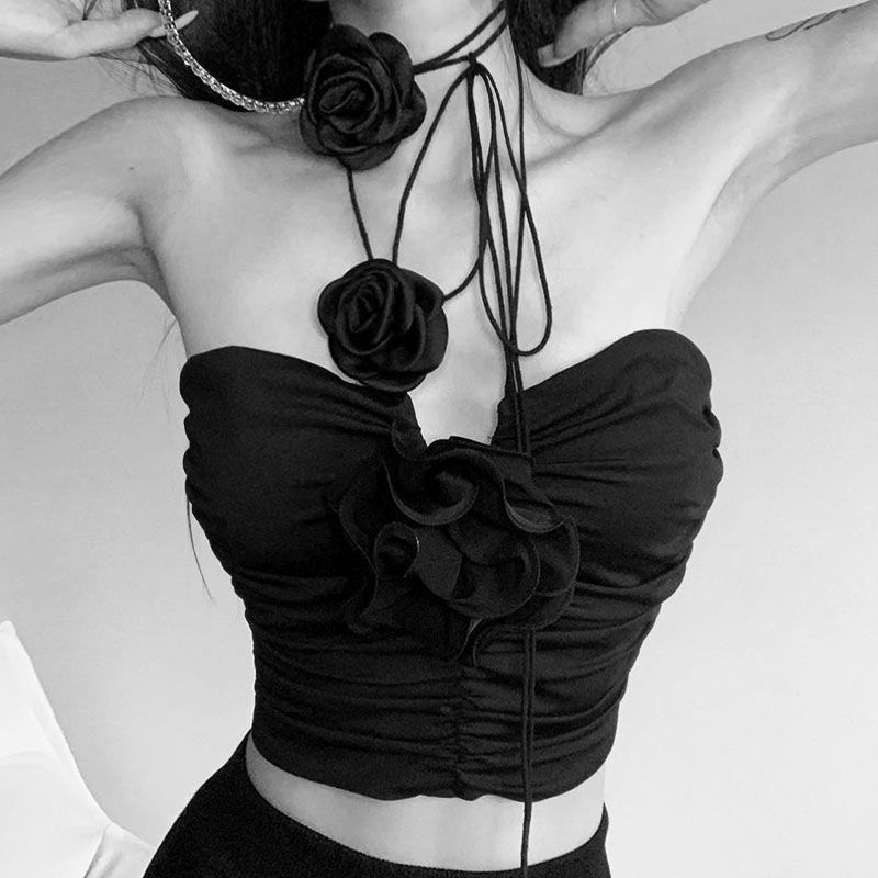 暗黑惊艳性感花朵挂颈背心设计感显瘦短款褶皱抹胸内搭辣妹上衣女