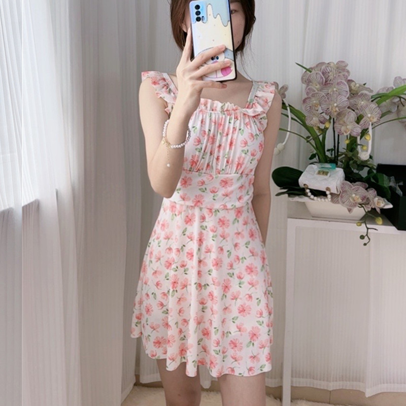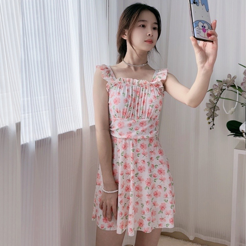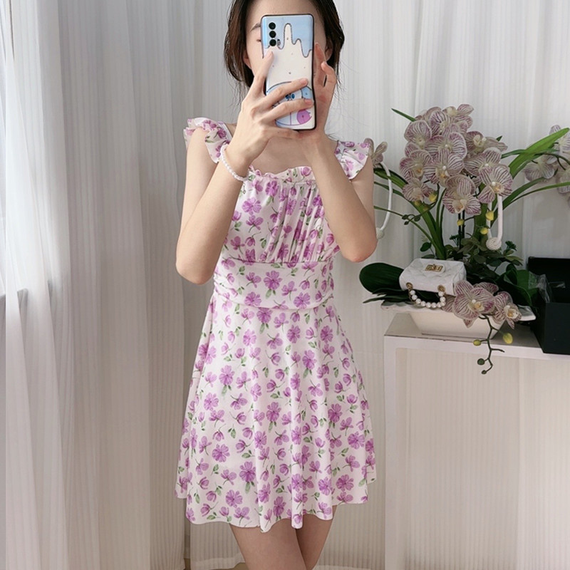 仙气游泳衣女连体平角保守显瘦遮肚少女温泉学生碎花温泉甜美泳装