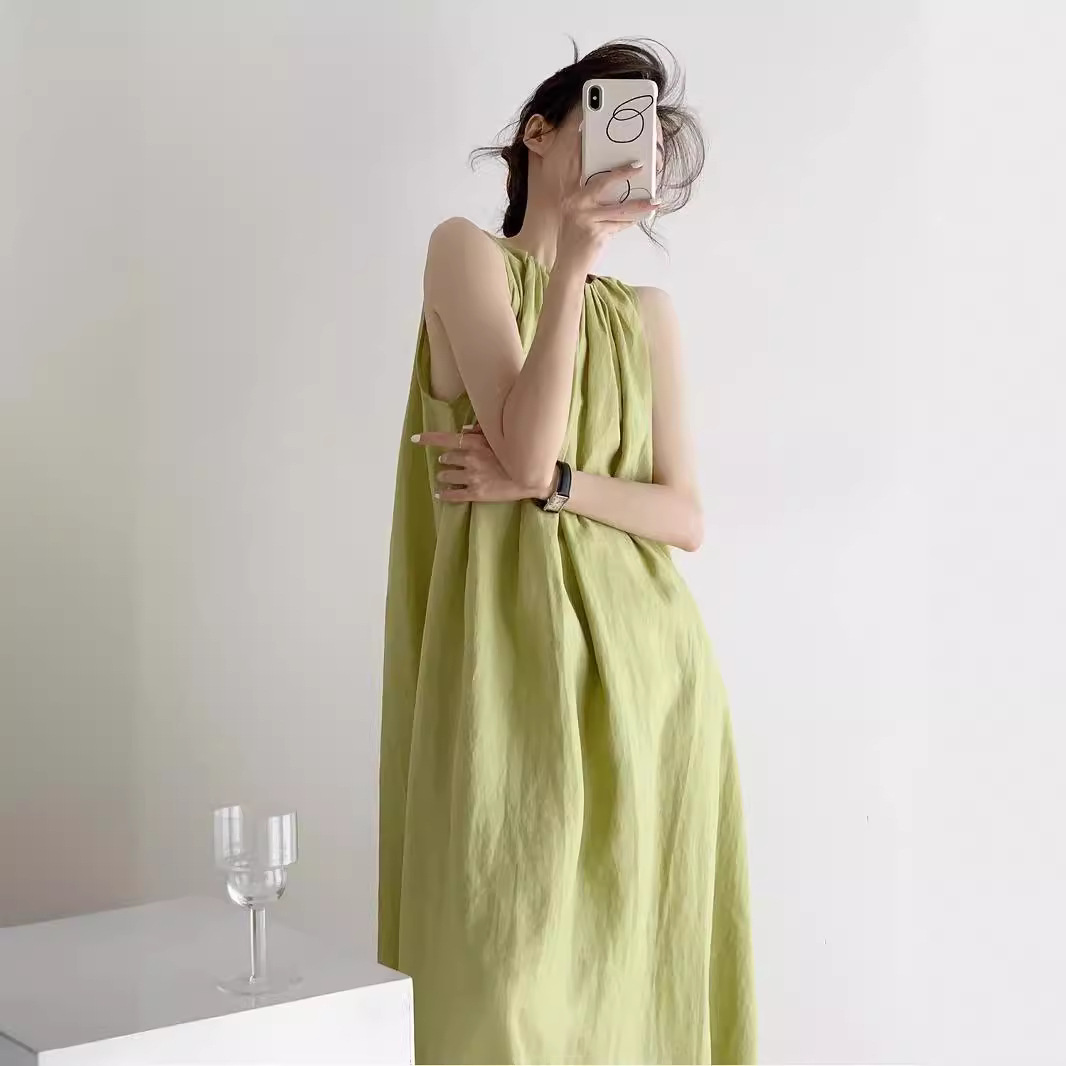 海边度假高级感裙子女宽松遮肉茶歇棉麻无袖挂脖气质显白连衣裙夏
